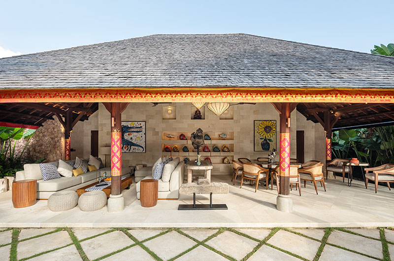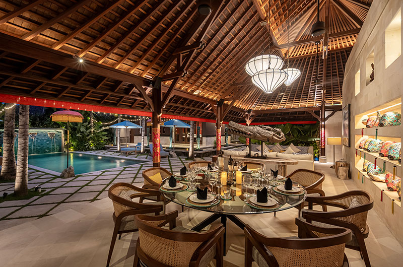 The dining area sits in the same open plan pavilion by the pool, offering blissful views of the pool while you dine. Surrounded by tropical views and crowned by a high thatched ceiling, the dining area has an irresistible feel of Bali to it.