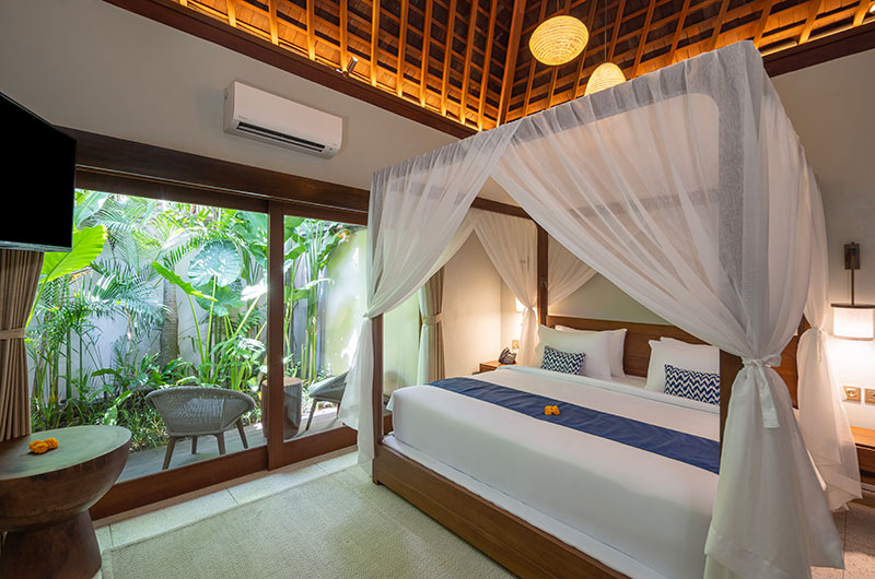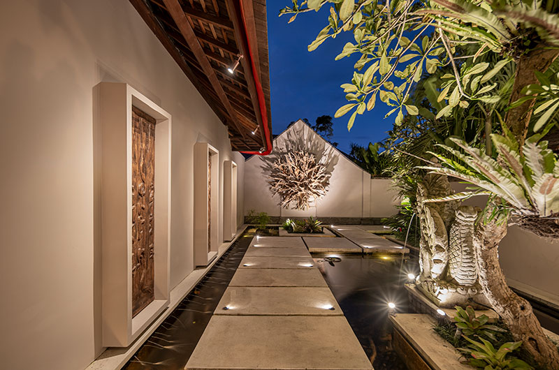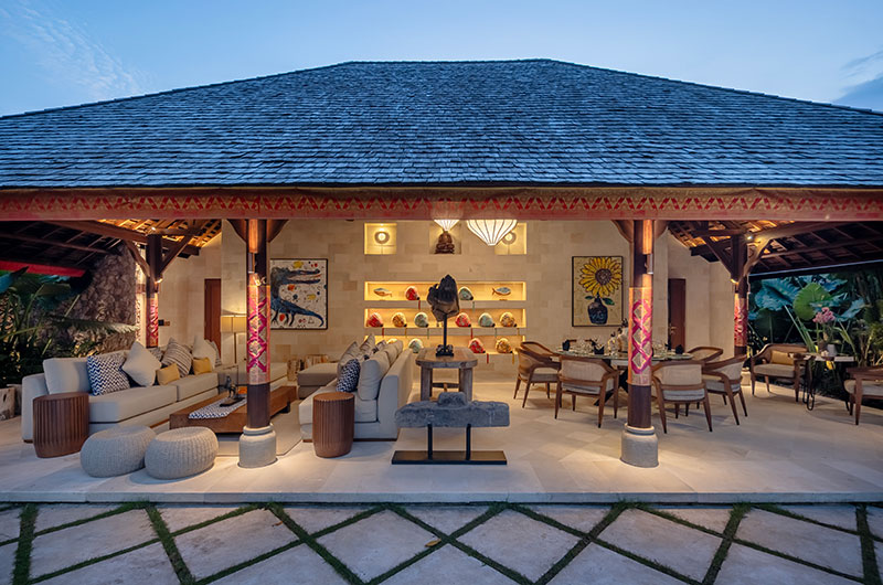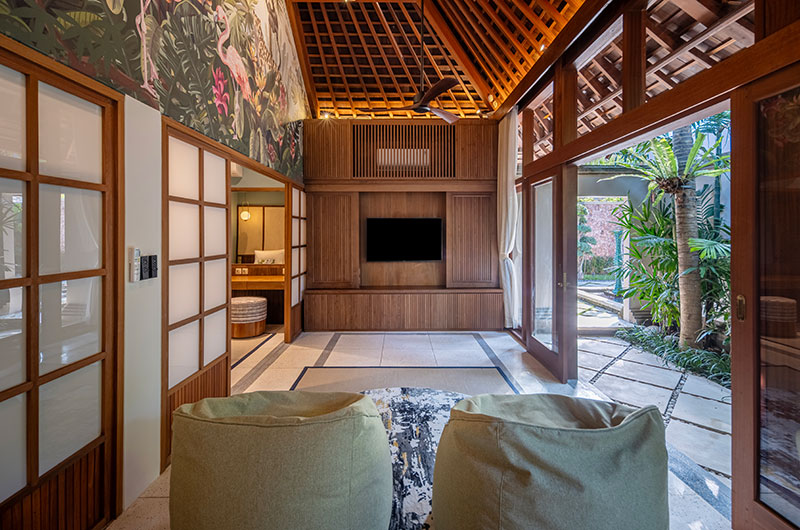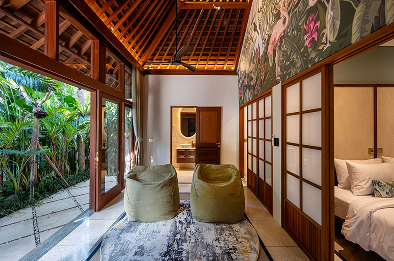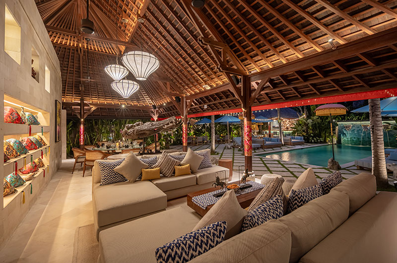 With its open plan layout and gorgeous alang-alang ceiling, the living room captures the tropical feel of Bali to a T. Gazing over the swimming pool, the lounge area can seat a large group on plush white sofas. When you’re craving a change of scenery, you’ll find multiple seating areas and cosy corner scattered throughout the property – the joy is in discovering them as you meander through those lush gardens.