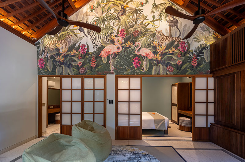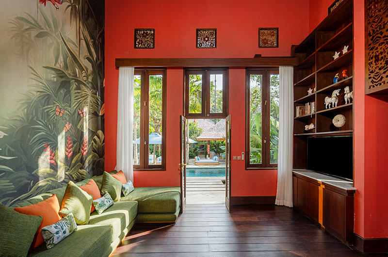 Get the gang together for a movie night or steal away for some reading in the villa’s media room – which also doubles as a library! Featuring a gorgeous jungle themed mural, the room features a large moss green sofa, well-sized TV, and an impressive collection of books. Disco lights and a disco ball add some fun and pizzaz.