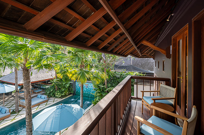 This room is located on the upper floor where it sits right above the spa room and next to the media room. The room features a king-sized bed and opens to a private balcony with lovely views looking over the pool. The ensuite bathroom is fitted with a shower, vanity, and a toilet.