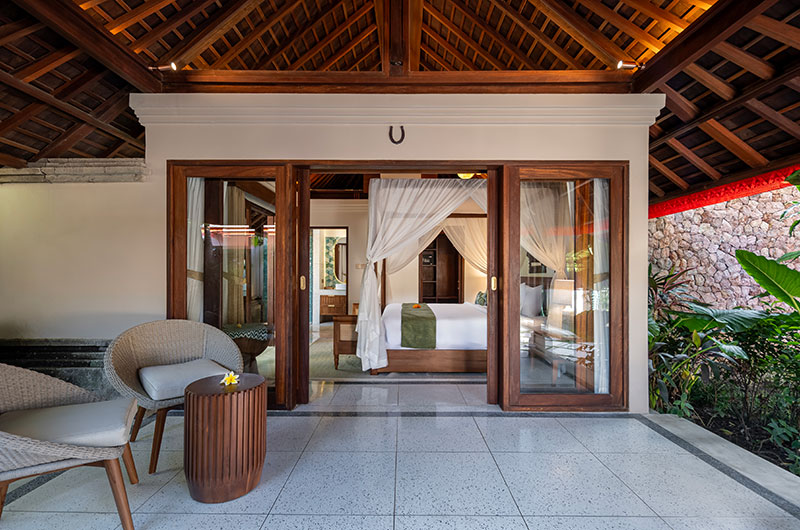 The Suaka Baliaga features seven bedrooms. The rooms are decorated in romantic Balinese style – think thatched alang-alang roofs, teakwood floors, dreamy canopy beds, timber furnishings, and beautiful textiles. The rooms are divided into multiple pavilions scattered across the gardens, offering each guest a private space to retreat to.