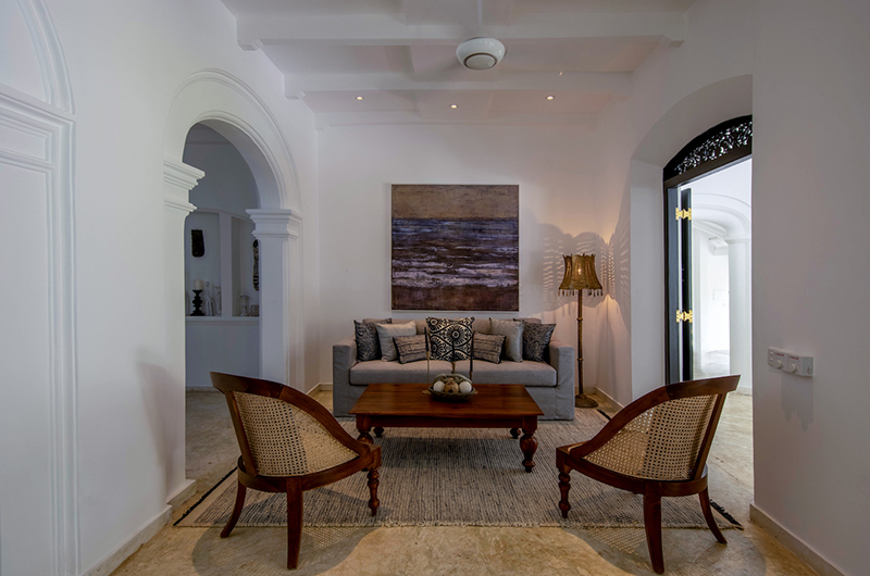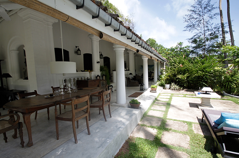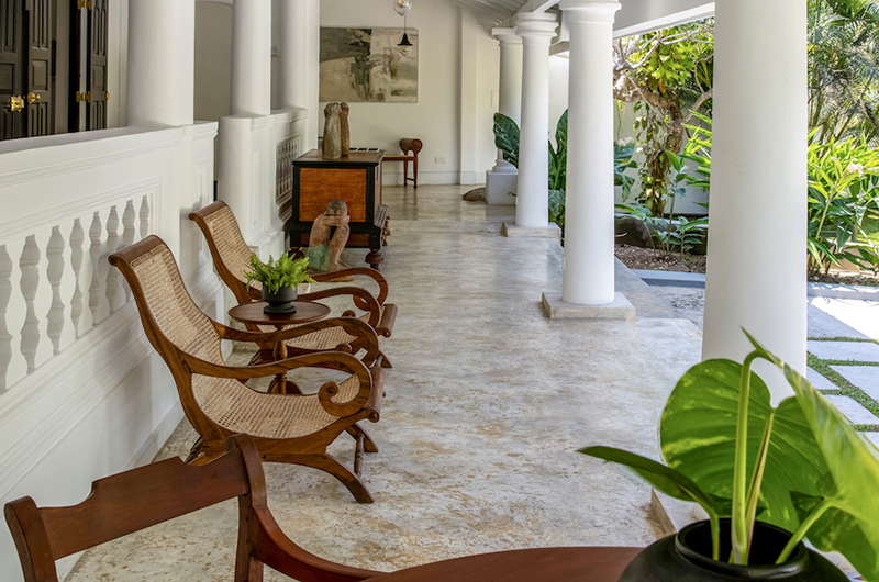The generous veranda wrapping around the villa works as a breezy alfresco living room. The veranda is generously furnished with plush sofas and armchairs, with views overlooking the surrounding gardens.