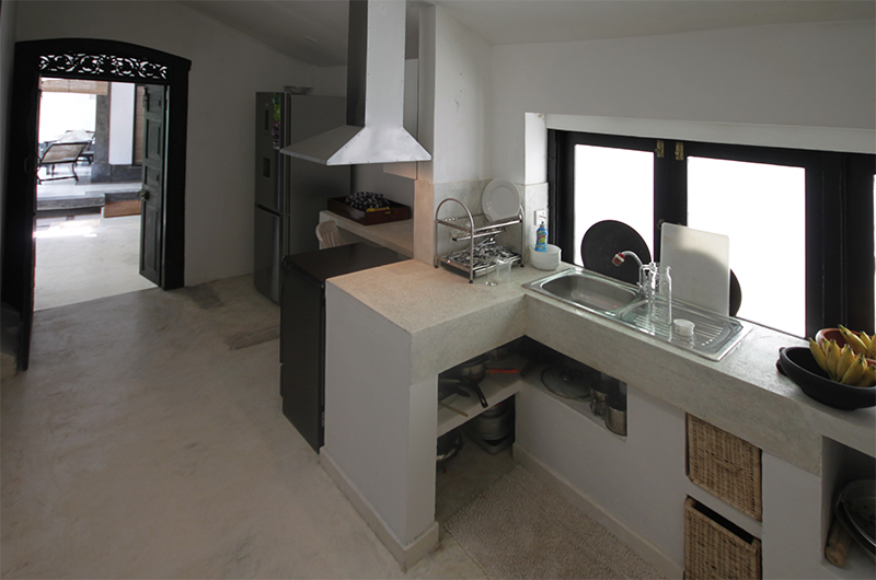 The Well House’s dining table is also located on the open-sided veranda and can comfortably seat all six guests. The villa includes a well-equipped kitchen.