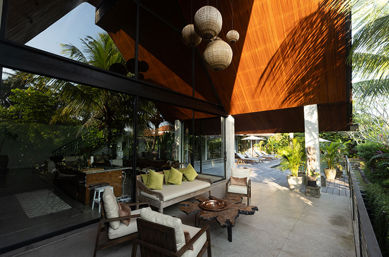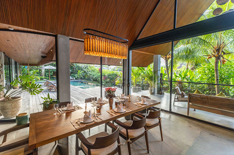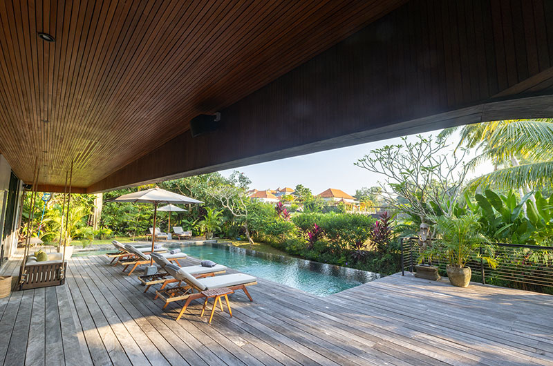 The Wing Bali invites guests to experience Bali’s natural splendour to the fullest. The villa is surrounded by rice fields and jungle views, and there is no better place to drink it all in than the villa’s sleek L-shaped swimming pool. The pool is enviably large in size and features an inviting shallow section where the kids can splash and play. The pool is hugged by a wooden deck dotted with sun beds and parasols. There’s also an alfresco lounge area close by – it’s the perfect place to sit and chat as another day in paradise draws to a close.