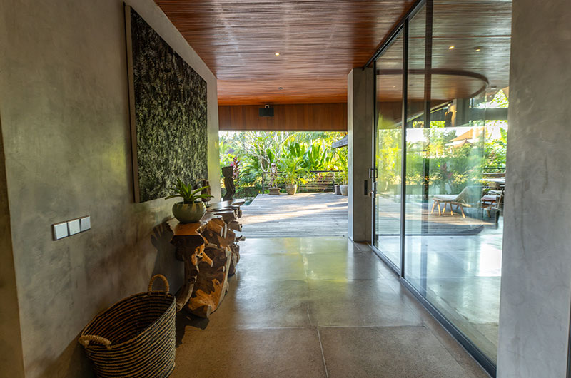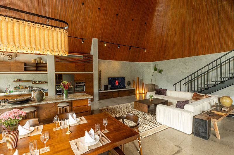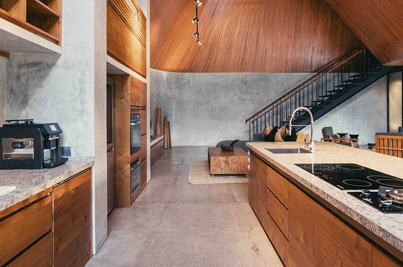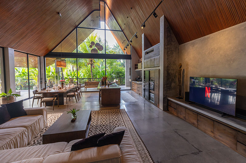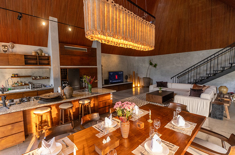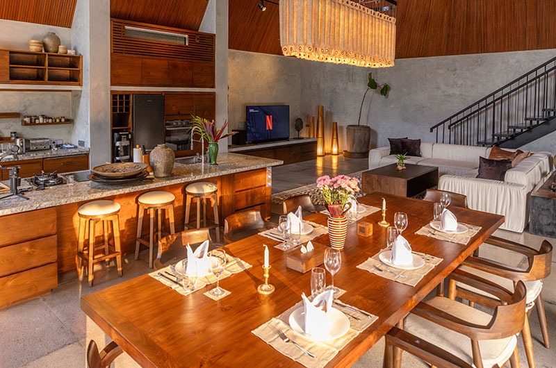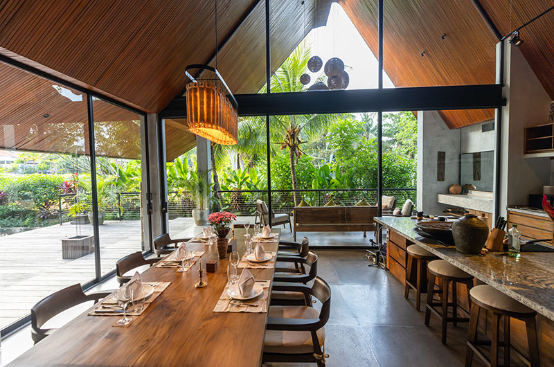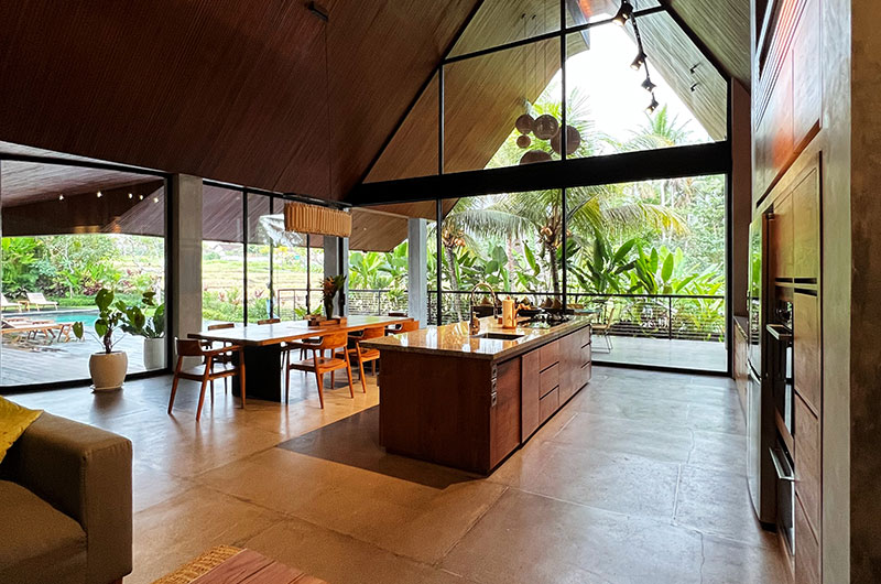 Dinnertime in the jungle! The villa’s beautiful timber dining table is positioned right by the full wall windows in the living room, allowing you to enjoy those gorgeous views while tucking into a great meal. The dining table is positioned close to the lounge area so you can keep the conversation going uninterrupted. The villa’s open plan kitchen is also incorporated into this fluid space, offering all the appliances and kitchenware you’ll need, including double fridges and a coffee maker.
