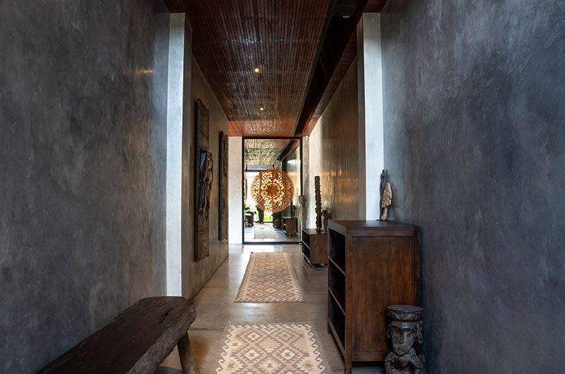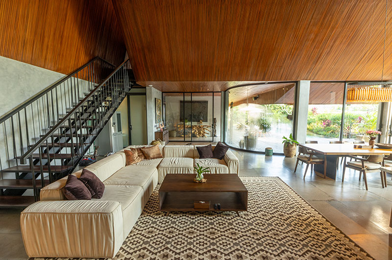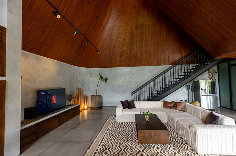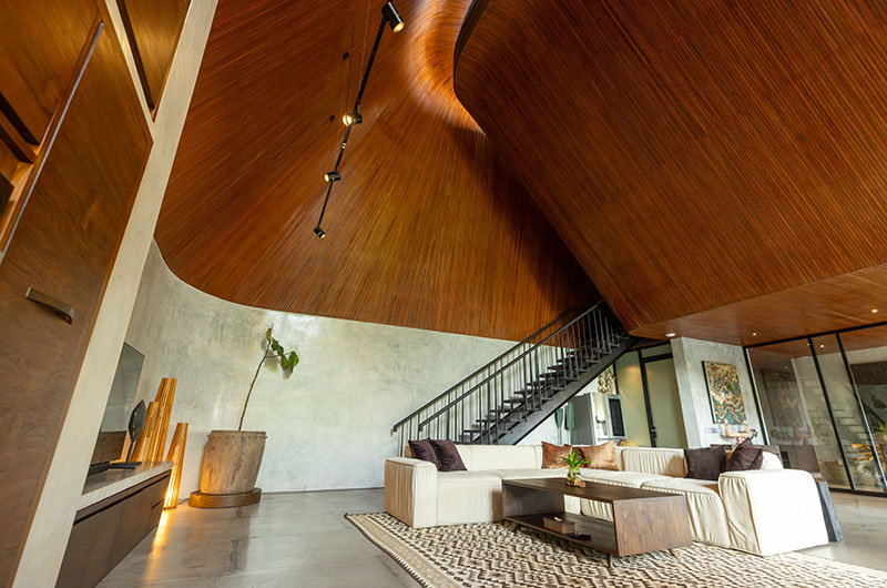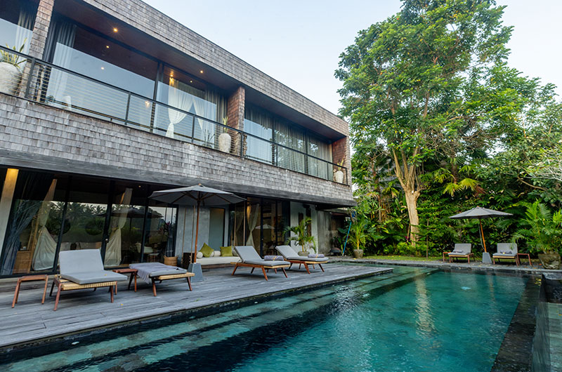 The Wing Bali is a six-bedroom villa that’s built over three floors. The main floor houses the living and dining areas, three bedrooms, and the villa’s large L-shaped pool. The upper floor houses three bedrooms. One bedroom is located on a lower ground floor.