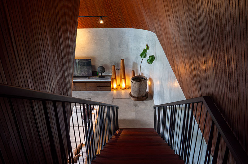 The Wing Bali is a triumph of craftsmanship – a true symphony of angles, curves, glass, and timber all working in perfect harmony. The villa cascades over three levels and offers a wonderful sense of space and light; a feeling that’s only amplified by the generous use of full wall glass. The colour scheme mostly relies on earthy tones of brown, beige, black, and grey. This allows the lush greens of the jungle and the blue hues of the pool to truly shine.