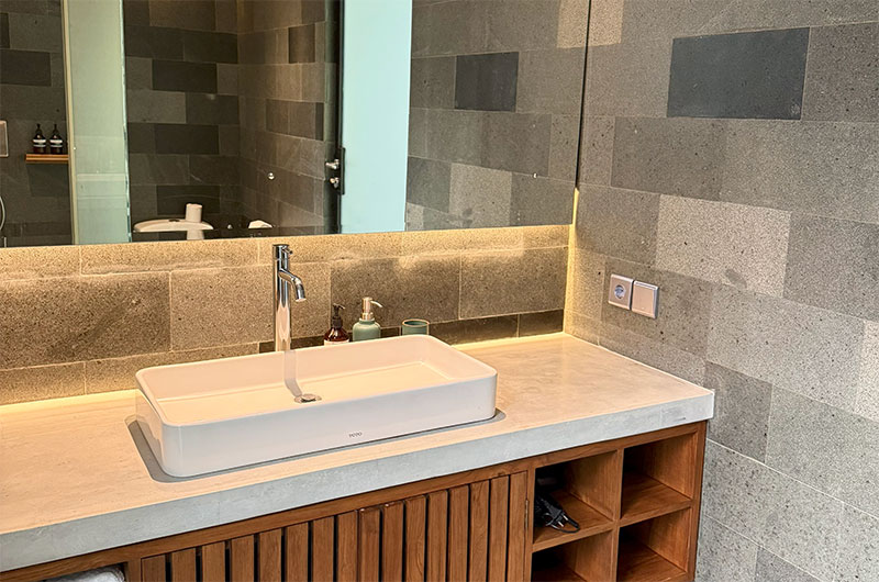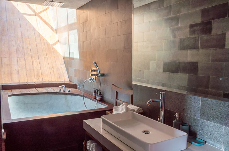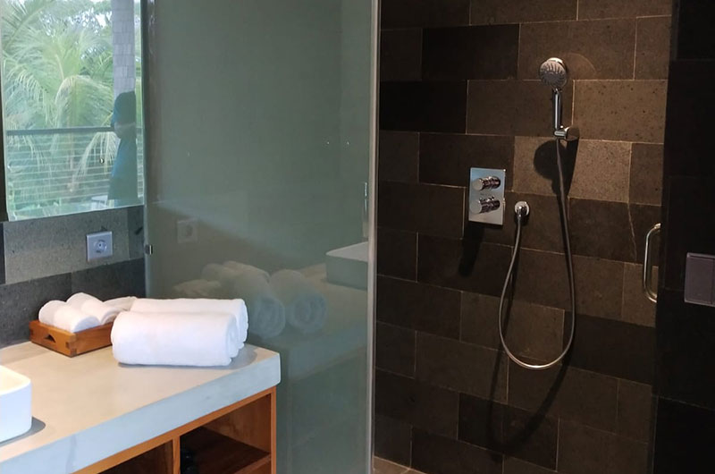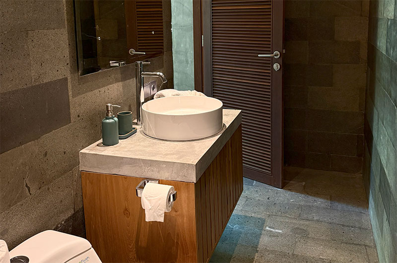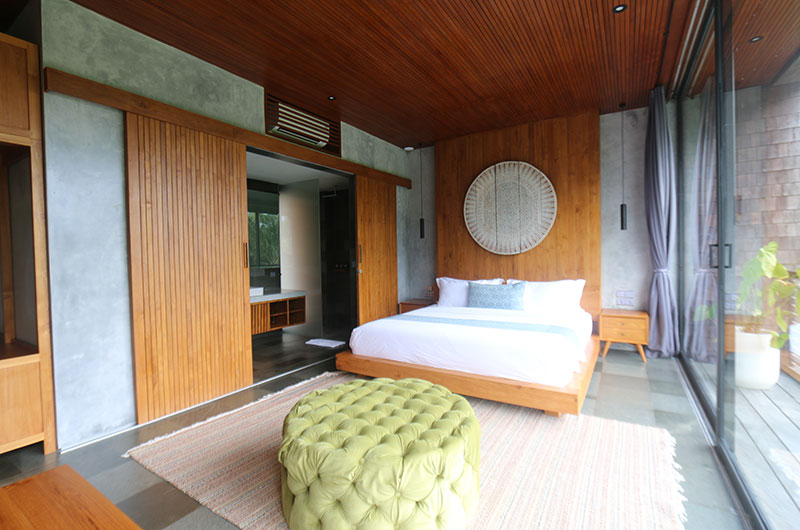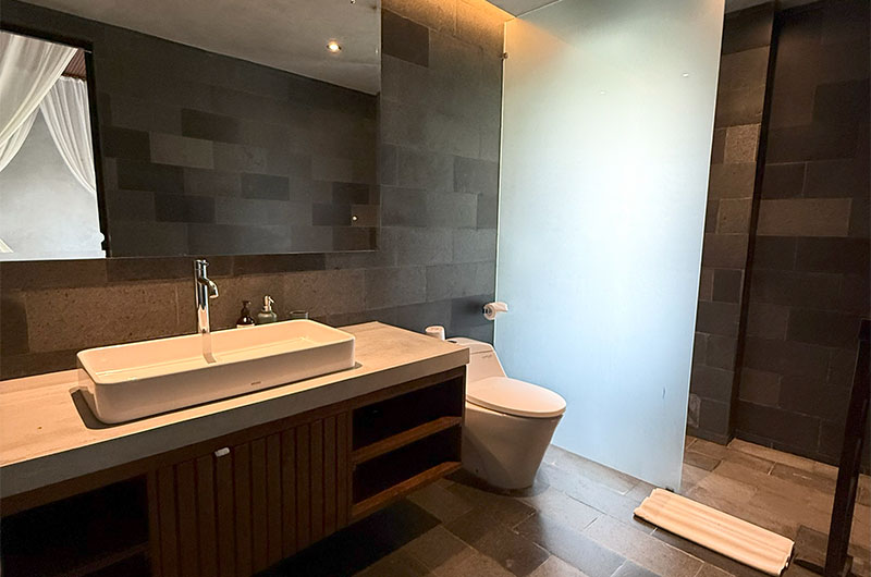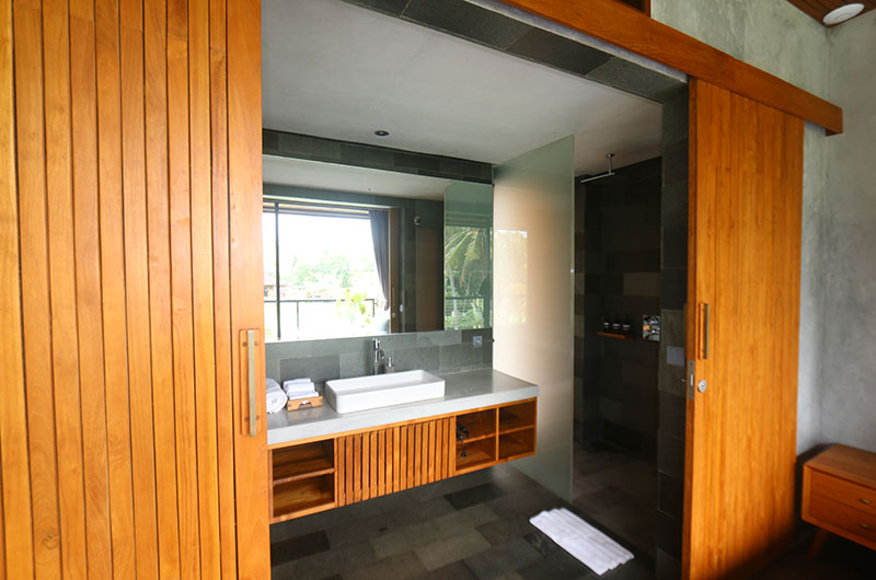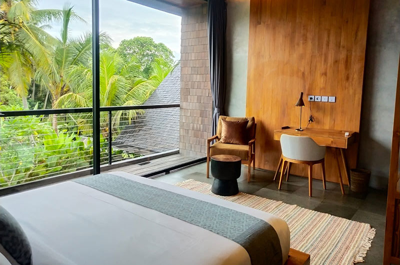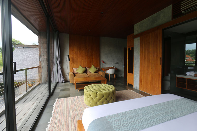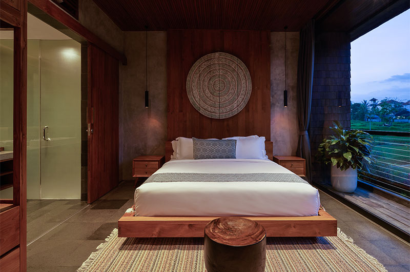 The first bedroom is located upstairs and opens to a scenic terrace looking over the rice fields and palm trees. The room features a king-sized bed and lounge area. The ensuite bathroom is luxuriously spacious and features a shower, vanity, and a toilet.
