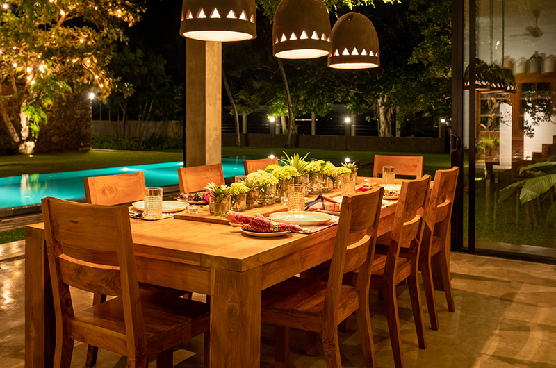 The living room is a beautifully styled space that’s surrounded by full wall glass on two sides. This ensures direct views of the pool and garden while you relax on the elegant off-white sofa or one of the matching armchairs. Monochrome and aqua blue textiles add depth and interest to the décor while beautiful objects d’art introduce a touch of Sri Lankan heritage. But this elegant space is not your only option as this lavishly spacious villa offers several areas to lounge around in. Our favourite might just be the breezy patio on the upper floor. Besides two red sofas and well curated curios and art pieces, this space also features a telescope that’s perfect for stargazing.