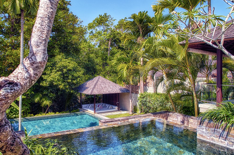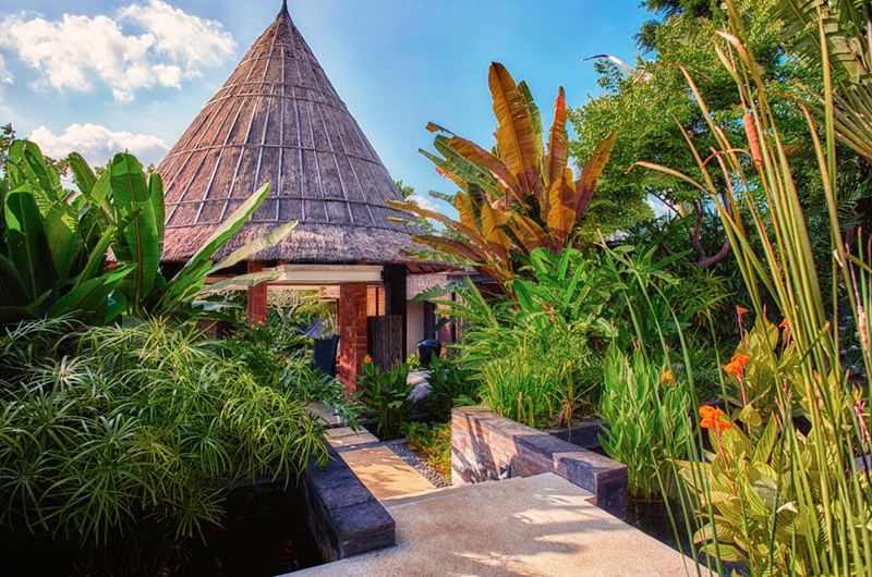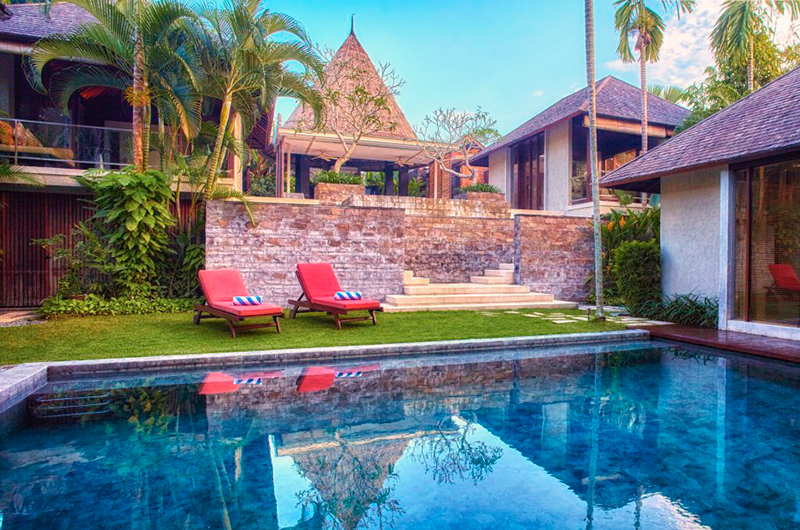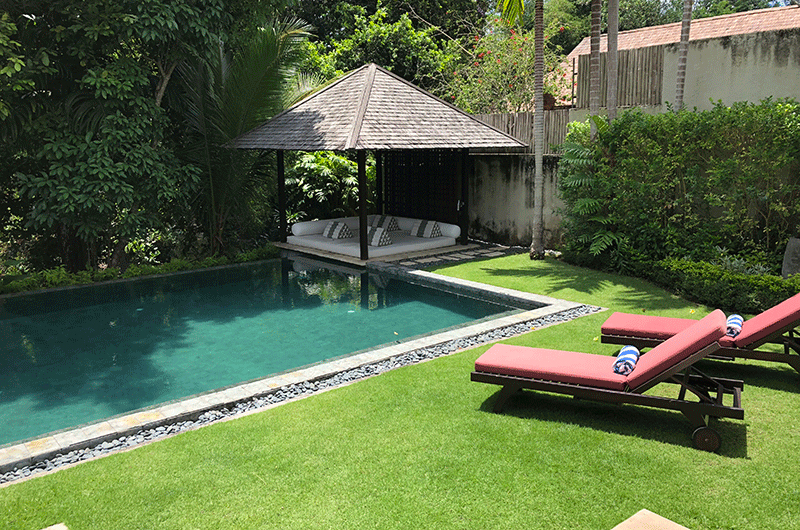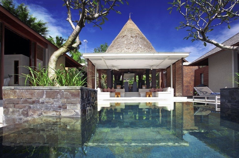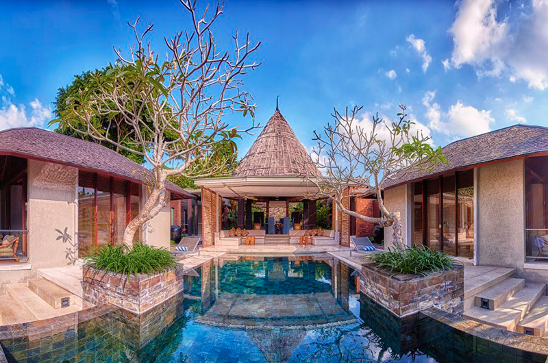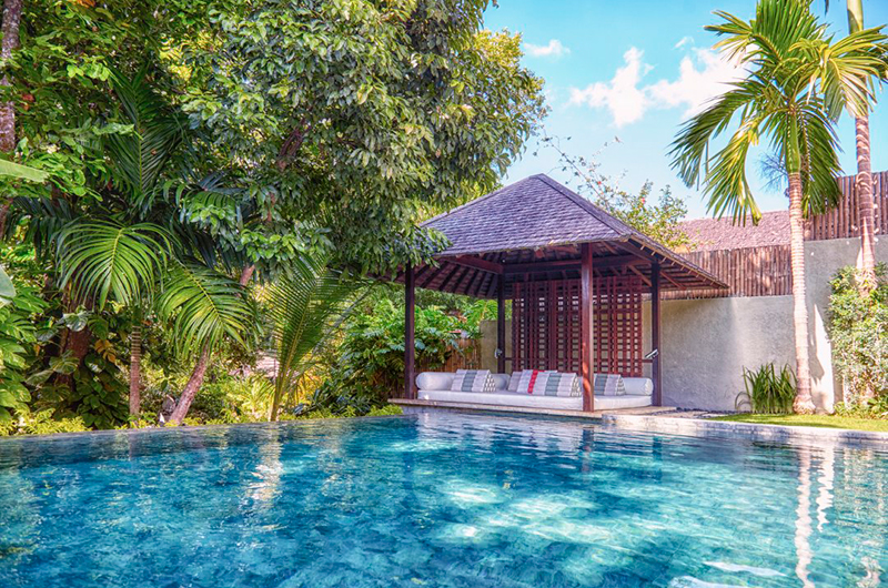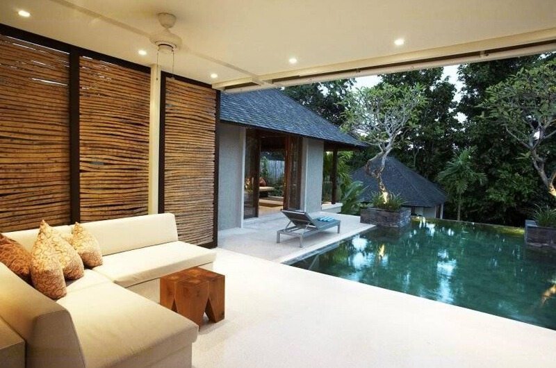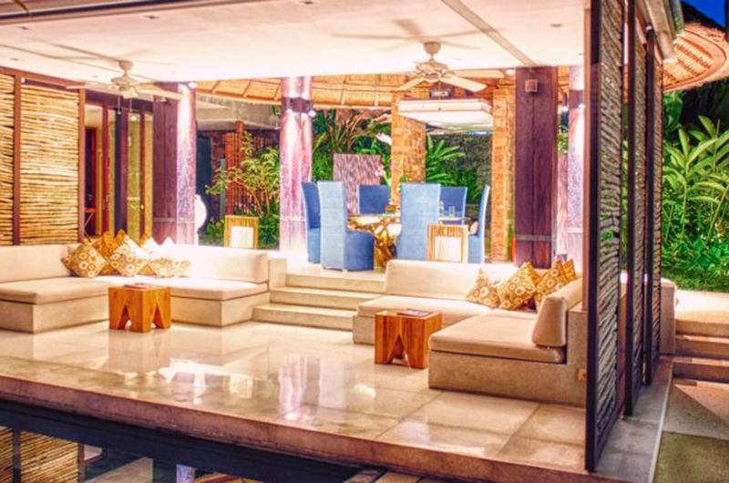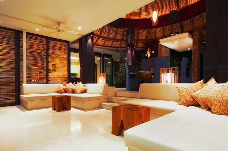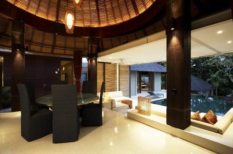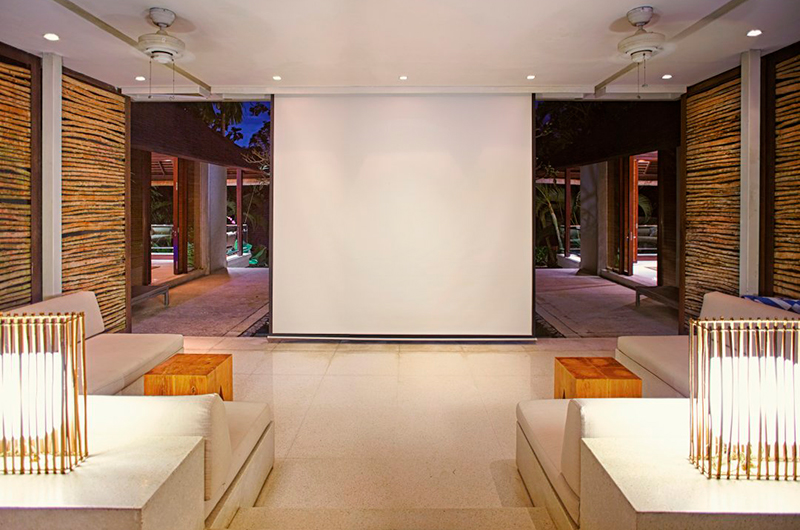 The open-sided living room lounge is located in a beautiful thatched roof pavilion at the highest point of the villa and offers scenic views of the two pools and the villa’s gardens. The lounge is furnished with sleek white sofas and if don’t want to settle just for the poolside views, a 145-inch projector screen can be lowered down from the ceiling with the push of a button.