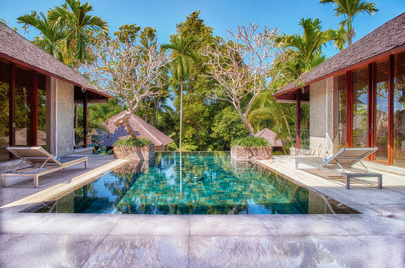 A round dining table surrounded by eight high-back chairs is also located in the beautiful pool-view living pavilion, allowing guests to dine with a side of tropical views. There is a fully-equipped kitchen located to the side of the same pavilion.
