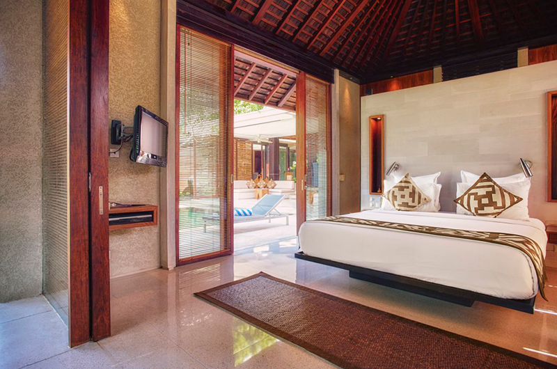 The third bedroom is located on the other side of the pool and comes with a king-sized bed, TV and an ensuite bathroom with a combined bathtub and shower.