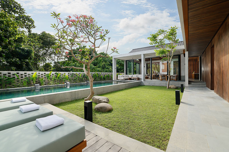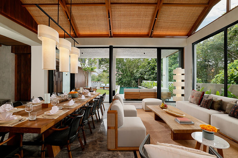 With its minimalist furniture and elegant colour palette, the living room continues the subtle Japanese theme of the villa. There are ample sofas and armchairs for guests to lounge on, with glass doors revealing luscious views of the pool and garden. Beautifully curated textiles and carpets add interest and depth to this harmonious space.