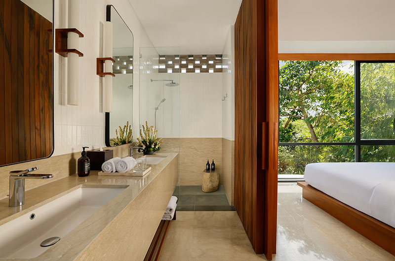 The first bedroom is located on the ground floor. It features a king-sized bed and an ensuite bathroom offering all the necessary comforts: a walk-in shower, semi open-air shower, vanity, and a toilet.