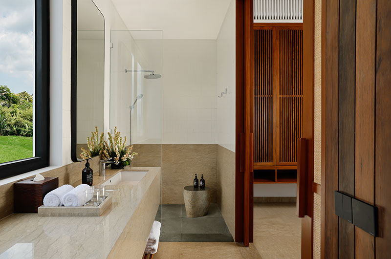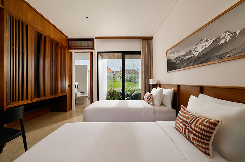 Also located on the ground floor, this room features two single beds. The ensuite bathroom has a lush tropical feel to it, featuring a walk-in shower, semi open-air shower, vanity, and a toilet.