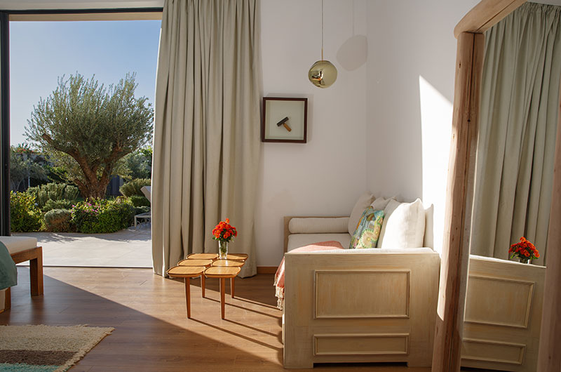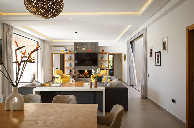 The air-conditioned living room is the picture of modern style. There’s a generous sofa to relax on, a TV to keep you entertained, and a fireplace to add a warm glow. Glass doors open to the poolside terrace on one side and lead out to a lovely courtyard on the other.