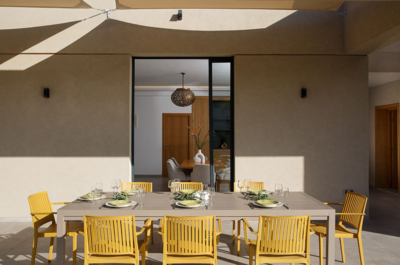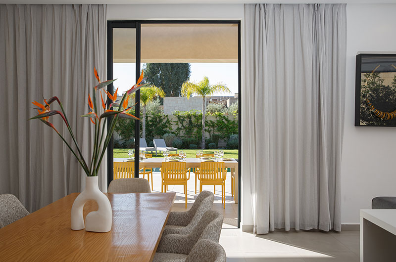 The dining area is a fluid extension of the living room. The timber dining table can seat all eight guests with ease. If you prefer, you can also enjoy your meals out by the pool where a rectangular dining table surrounded by eight yellow chairs offers a lovely setting for dining alfresco.
