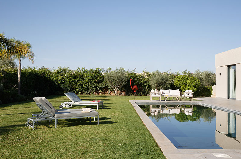 The manicured gardens perfectly match the villa’s sleek design. The main attraction is the 14-metre-long pool which can be heated during the colder months. The pool is framed by sun beds, parasols, and generous stretches of lawn, with a pétanque court adding a unique twist.