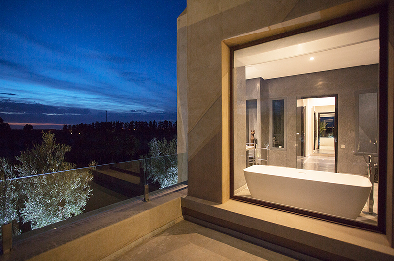 Immensely spacious, Villa Adnaa features multiple living areas. The first one is a relaxing lounge featuring plush blue sofas set around a modern fireplace. Attached to this lounge is the villa’s main living area furnished with a crimson velvet sofa and stylish art pieces. Perched on the top floor is an alfresco lounge boasting mesmerising views of the pool and garden – the perfect spot for sunset cocktails or an afternoon tea service.