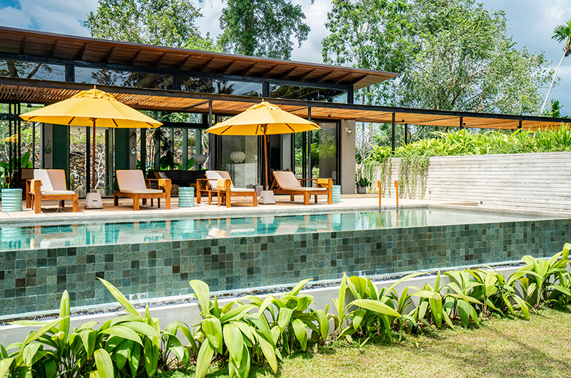 Villa Alba is a five-bedroom split level villa. As you enter the villa, you’re first greeted by the living and dining room which looks out to the 12-metre-long pool waiting right outside. Looking out towards the pool, there are two bedrooms to the right hand side and three to the left. From the poolside terrace, stairs lead down to the lawned garden area below.