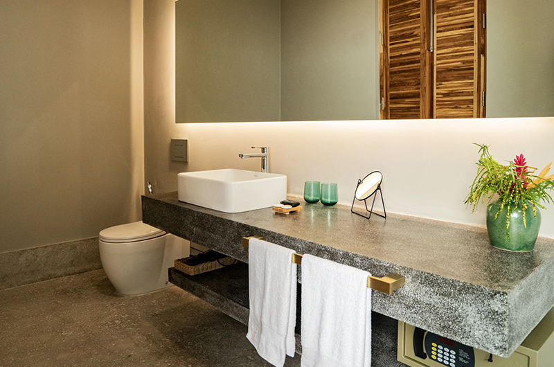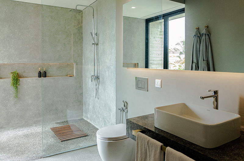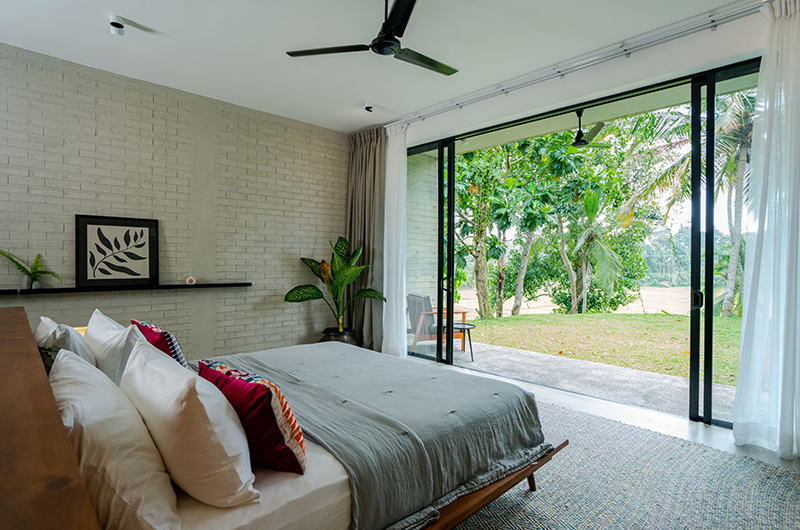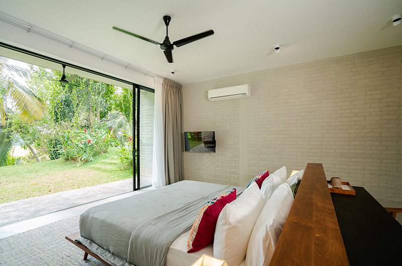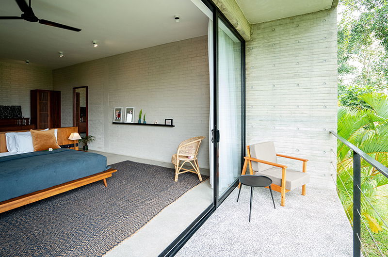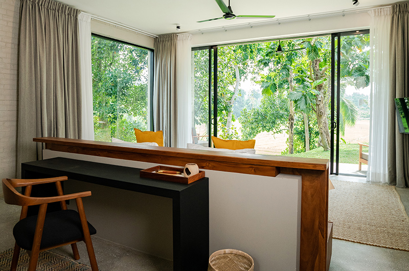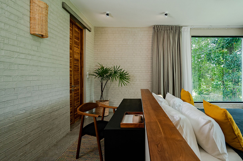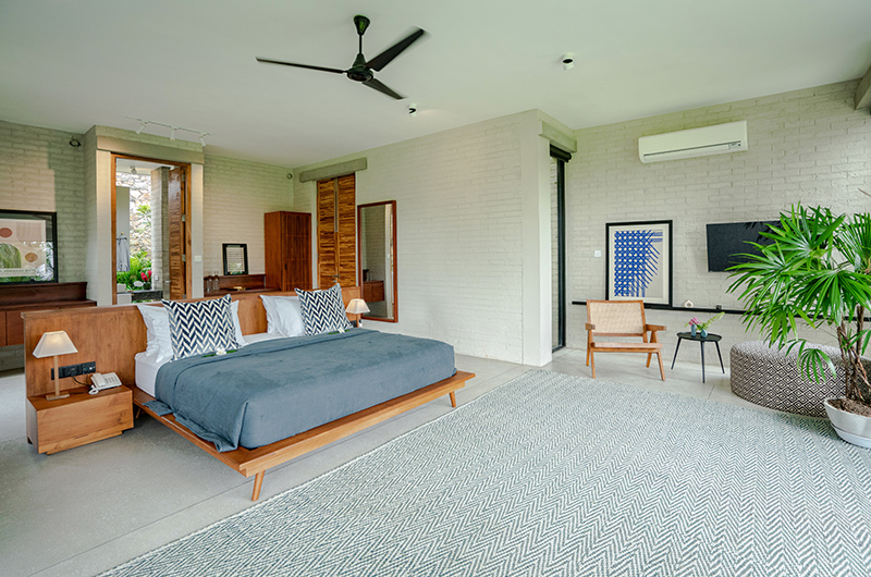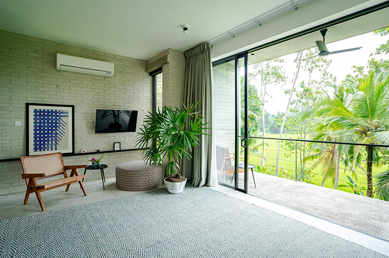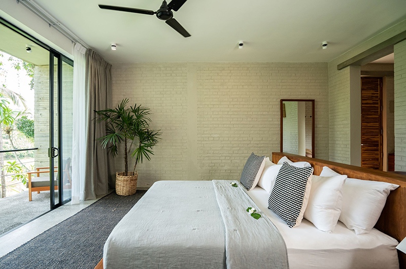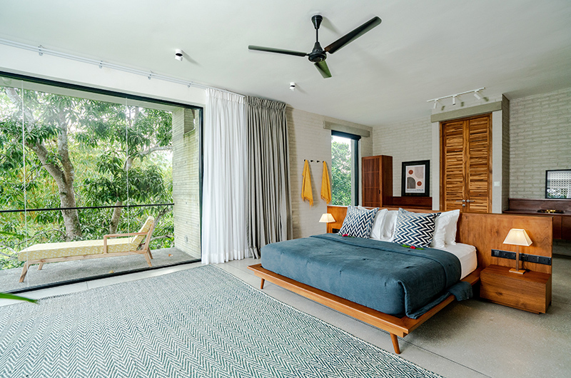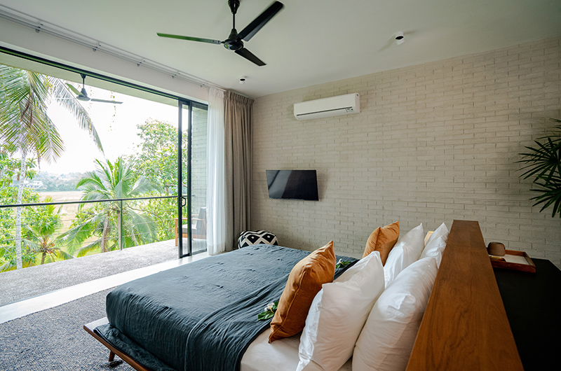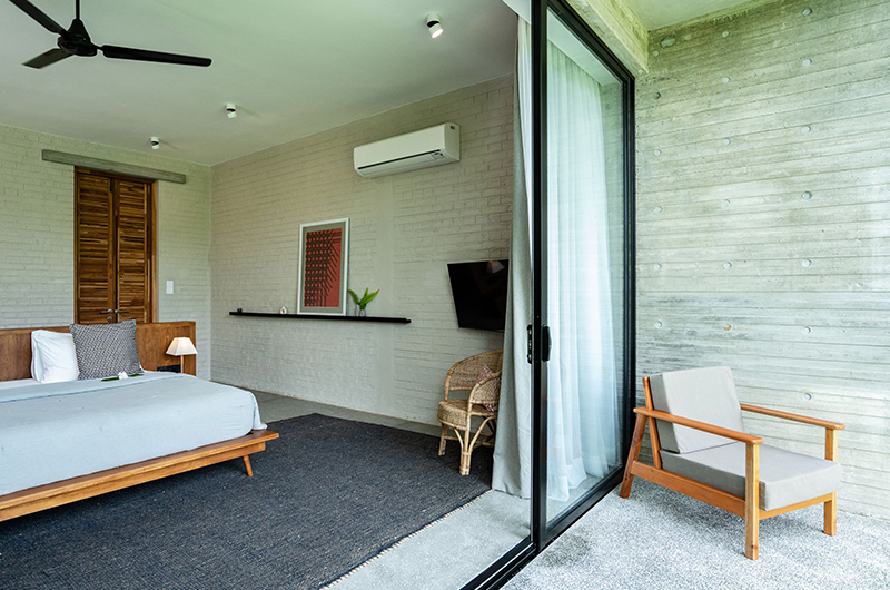 The first bedroom occupies a corner and features full wall windows on two sides. These glass doors reveal a furnished balcony which offers serene views of the surrounding rice fields. The bedroom is luxuriously spacious and features a king-sized bed, flatscreen TV, a writing desk and closets. The ensuite bathroom has a luscious semi-open layout and it features a shower, dual vanities and toilet.