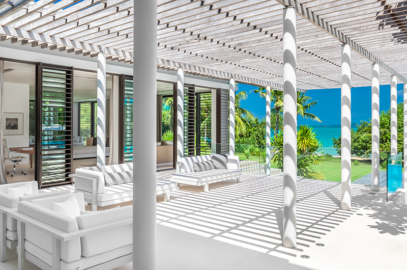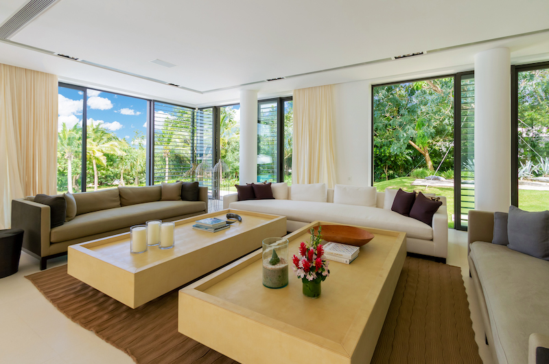 Surrounded by glass doors offering views of the pool and ocean, the games room comes furnished with a pool table and an ample seating area accommodating up to 12 guests.