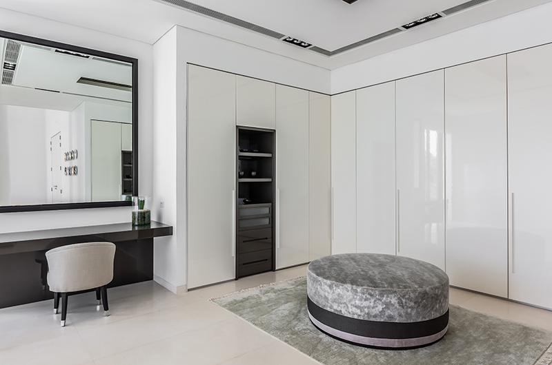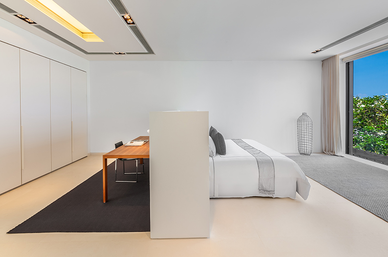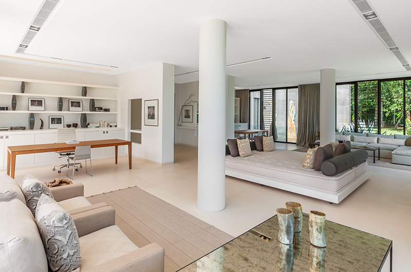 Villa Amarasara’s double-height living and dining room is decorated in crisp tones of white, with glass doors looking out to the ocean. The palatial space incorporates two seating areas, each seating up to 12 people, with a Sonos sound system and full air-conditioning offering equal measures of entertainment and comfort. If you absolutely must catch up on some work during your stay, the villa comes with a well-equipped office room with two desks and a seating area for 12 guests.