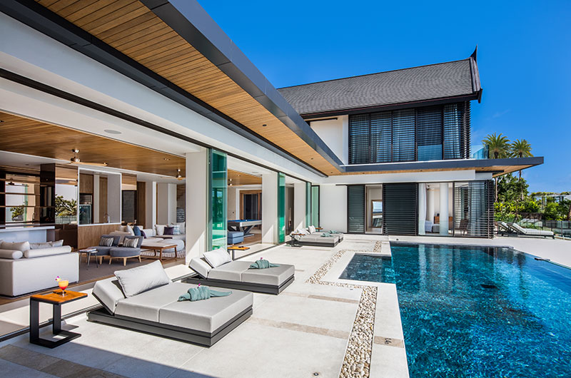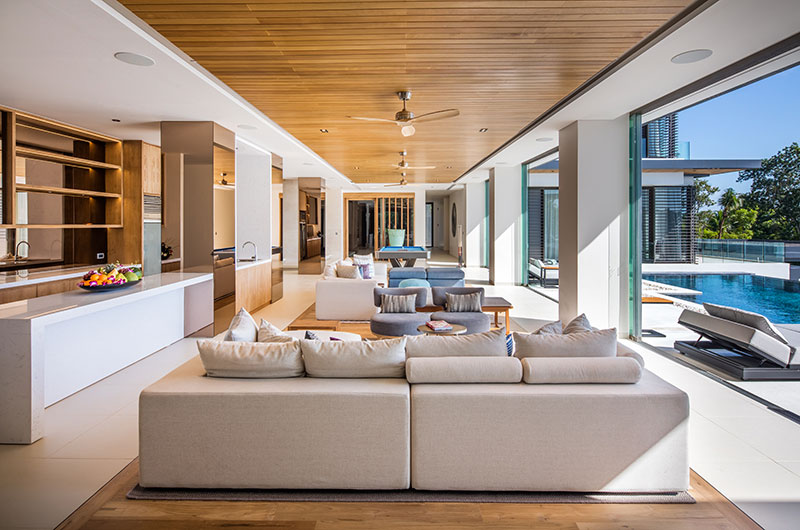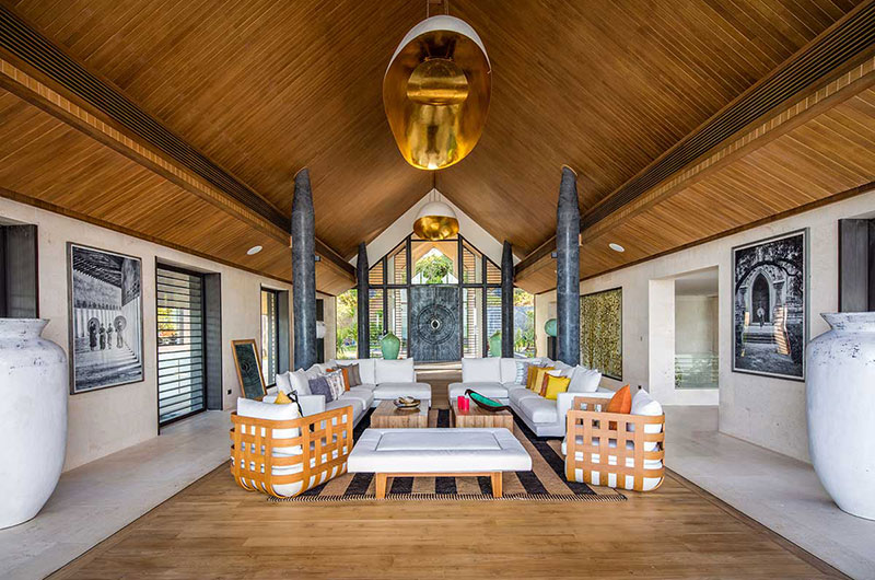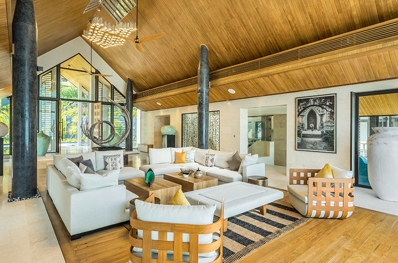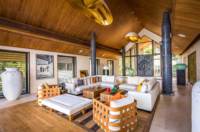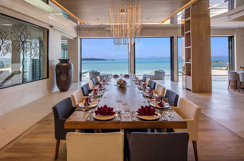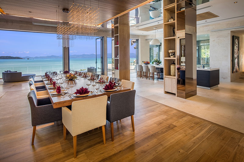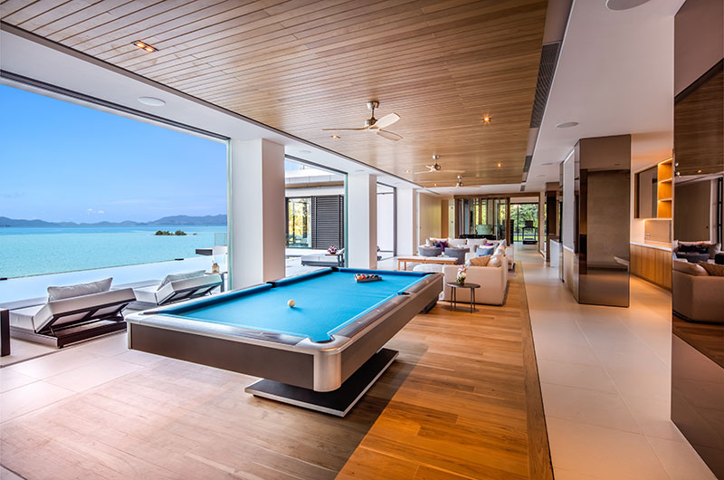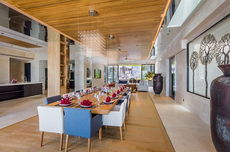 You will discover multiple lounge areas, seating arrangements, and cosy corners dotted throughout this palatial property. Thanks to its vaulted ceiling and sublime sea views, the main living room has a regal air to it. The ample lounges can easily seat a group of 12, with the adjoining outdoor lounge offering even more space. The air-conditioned room is fitted with a Sonos sound system so you can curate the soundtrack to your liking. The nearby dining room also has a lounge area, as does the poolside sala. Another fabulous space to spend time is the lounge room which adjoins the villa’s second pool. It features sofa seating for 14 guests, a smart TV, sound system, pool table, and a kitchenette.