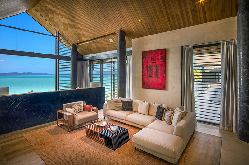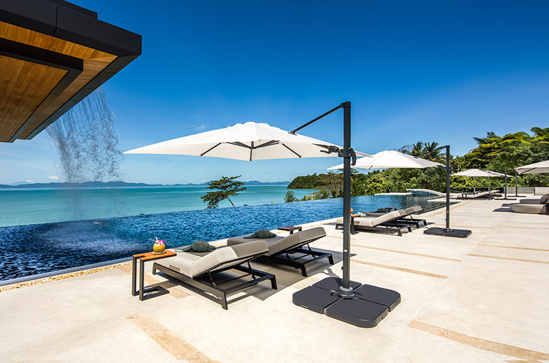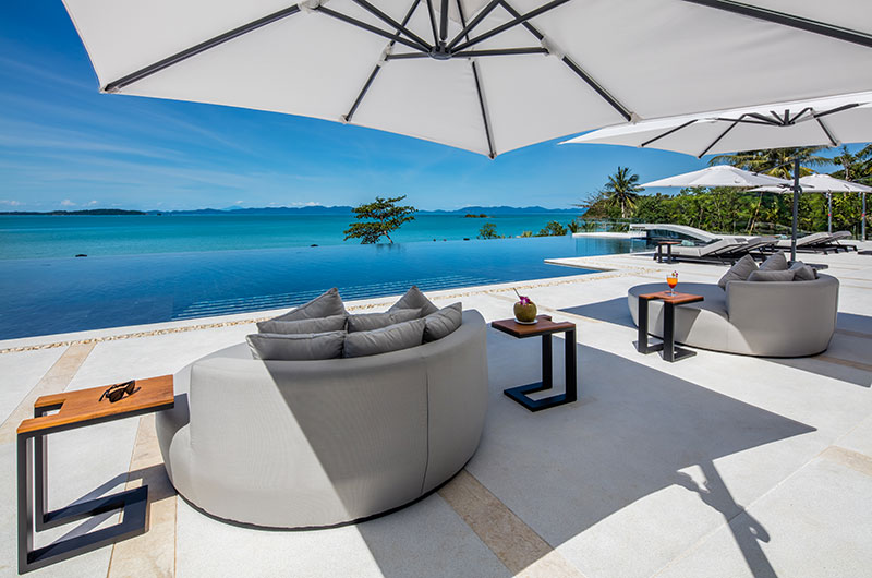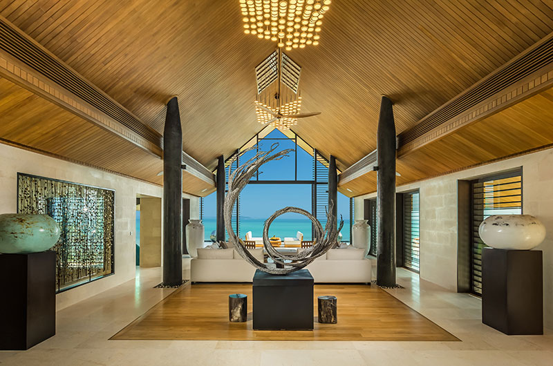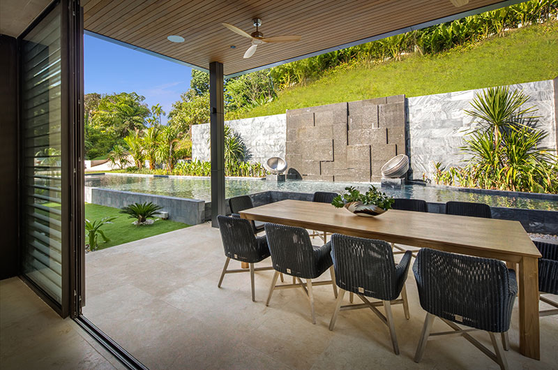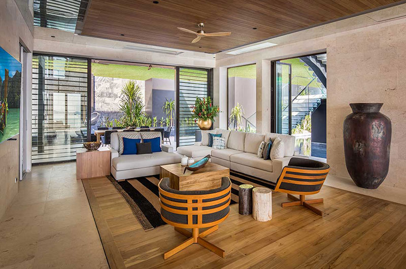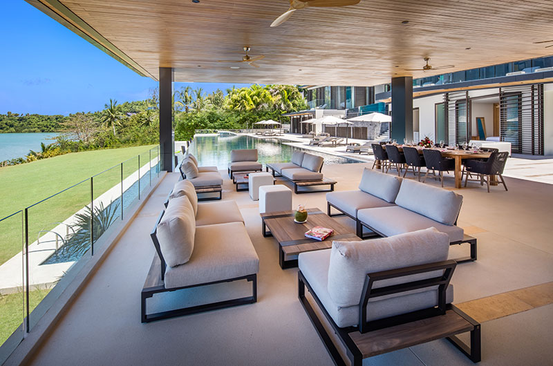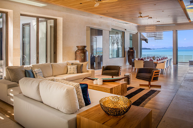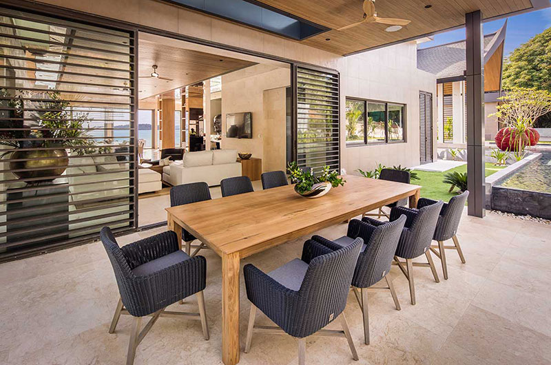 You will discover multiple lounge areas, seating arrangements, and cosy corners dotted throughout this palatial property. Thanks to its vaulted ceiling and sublime sea views, the main living room has a regal air to it. The ample lounges can easily seat a group of 12, with the adjoining outdoor lounge offering even more space. The air-conditioned room is fitted with a Sonos sound system so you can curate the soundtrack to your liking. The nearby dining room also has a lounge area, as does the poolside sala. Another fabulous space to spend time is the lounge room which adjoins the villa’s second pool. It features sofa seating for 14 guests, a smart TV, sound system, pool table, and a kitchenette.