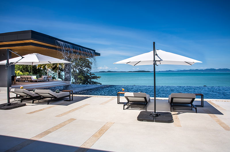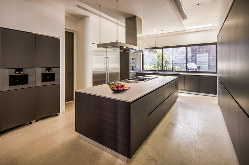 The villa’s gorgeous dining room invites you to dine in style, surrounded by all your favourite people and picture-perfect ocean views. The impressively long dining table can seat 16 guests, crowned with stunning modern chandeliers. Close by, there’s an outdoor dining area that can seat 12 – not to mention the pool sala which can seat 16 people in a gorgeous alfresco setting. The villa comes with a beautiful show kitchen and a robust staff kitchen fitted with extensive Gagennau appliances and high-end kitchen ware.