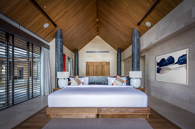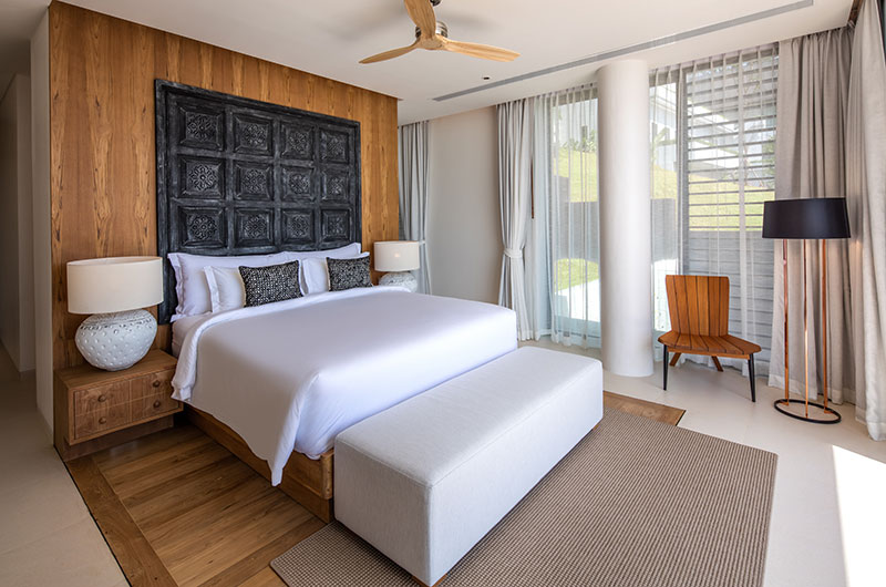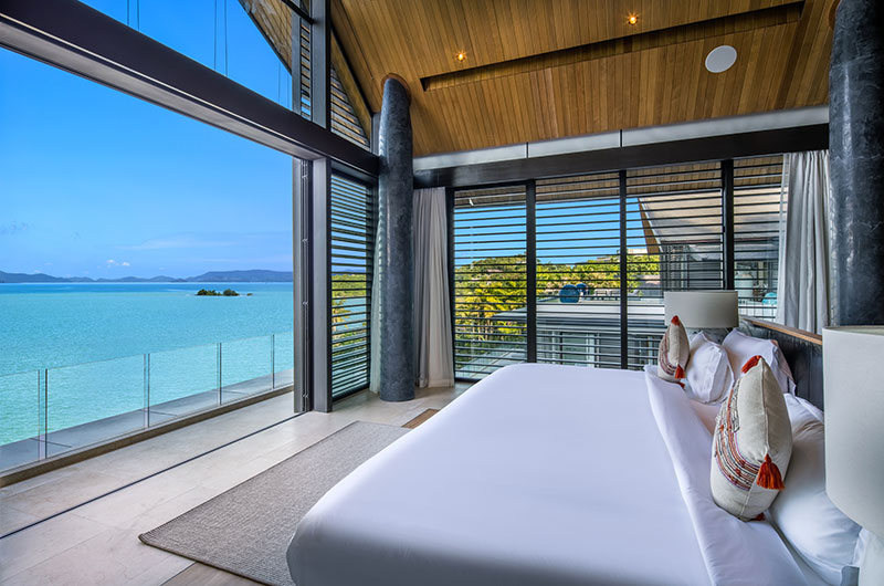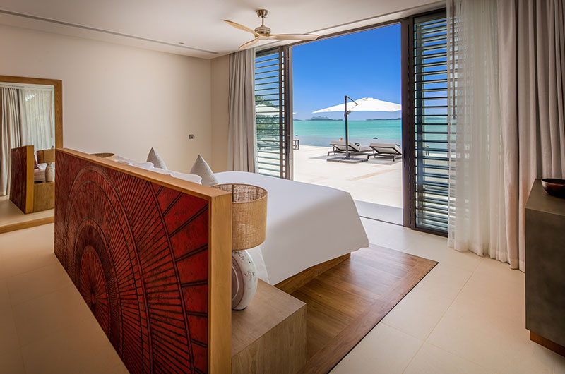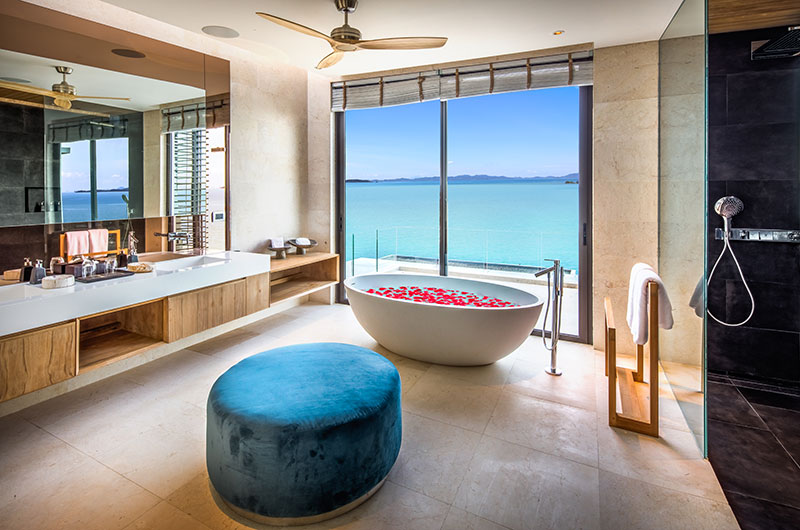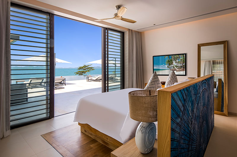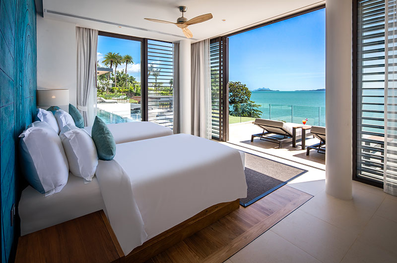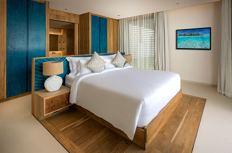 This room is located next to the second bedroom, and the two rooms are quite similar. There is a scenic balcony out front where you can relax on a sun bed while gazing out to the clear blue sea. The bedroom is fitted with either a king bed or two singles – whichever suits you best. The room also features a smart TV and his and her closets. The ensuite bathroom features a freestanding bathtub, walk-in shower, dual vanities, and a toilet.