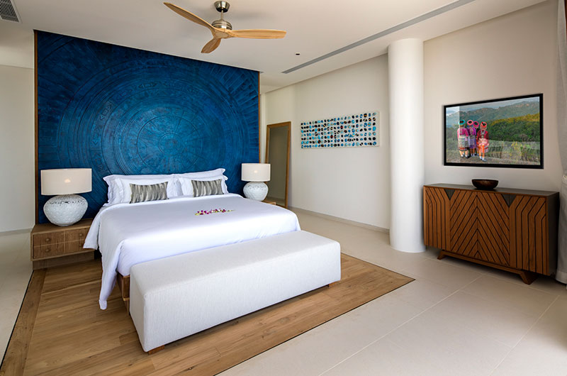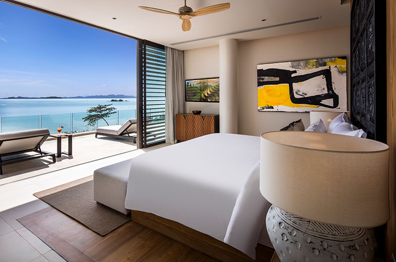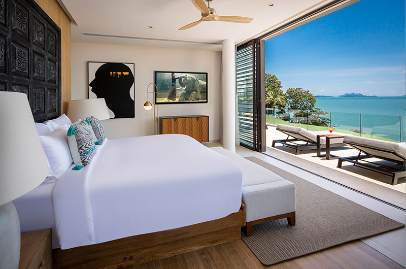 This room is located next to the fourth bedroom. The room opens to an ocean view balcony which features two sun beds. The bedroom is furnished with a king-sized bed and also features a smart TV and his and her closets. The ensuite bathroom comes with a gorgeous sea view bathtub, walk-in shower, dual sinks, and a toilet.