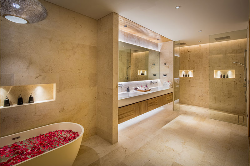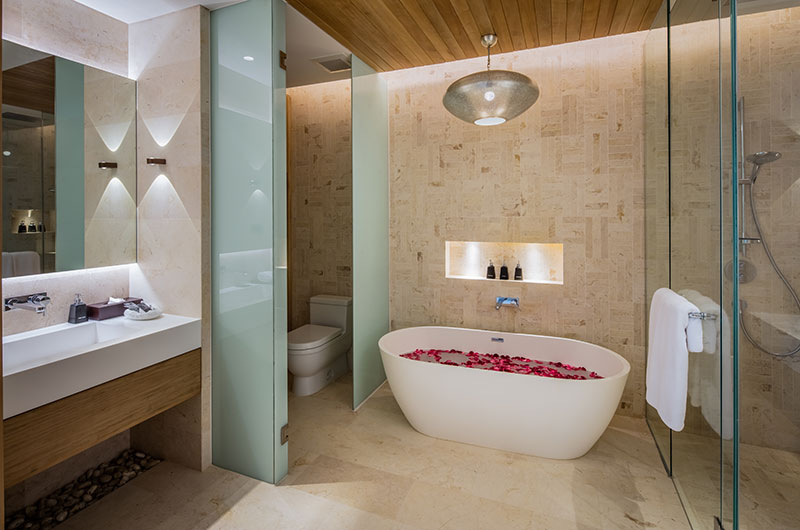 Also located close to the main pool, this room comes with a king-sized bed, smart TV, and his and her closets. The adjoining bathroom is fitted with a glamorous bathtub, walk-in shower, twin vanities, and a toilet.