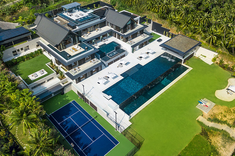 Villa Amaravida is an eight-bedroom villa that’s built over four levels. The main floor houses the living and dining areas, spa, and one bedroom. The lower ground floor houses the cinema room, games room, wine room, gym, swimming pool, jacuzzi, and four bedrooms. The second lower ground floor houses the main pool, tennis court, playground, squash court, and three bedrooms. The top floor features a rooftop bar area and a jacuzzi.