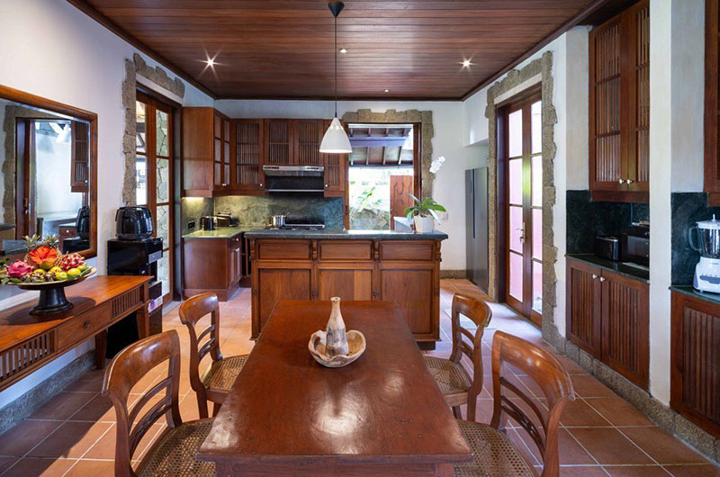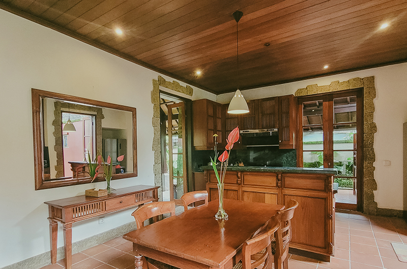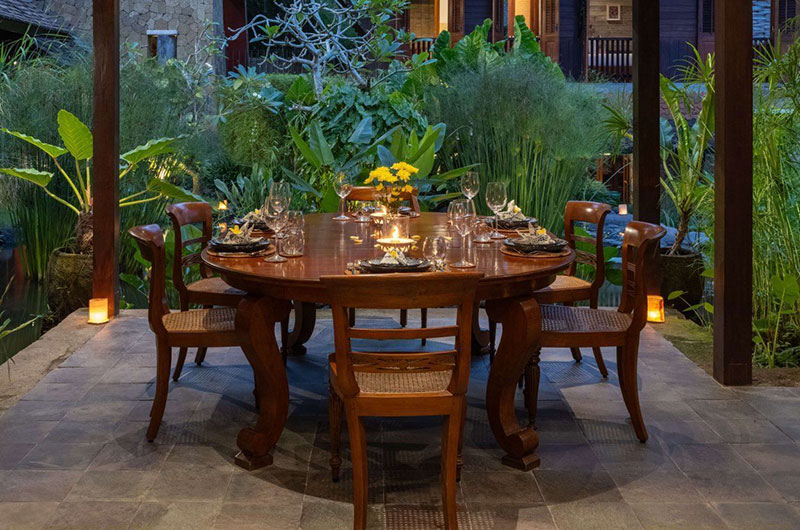 Just next to the living area is an outdoor dining area and a fully-equipped kitchen beyond. The dining table can comfortably seat 8 guests.