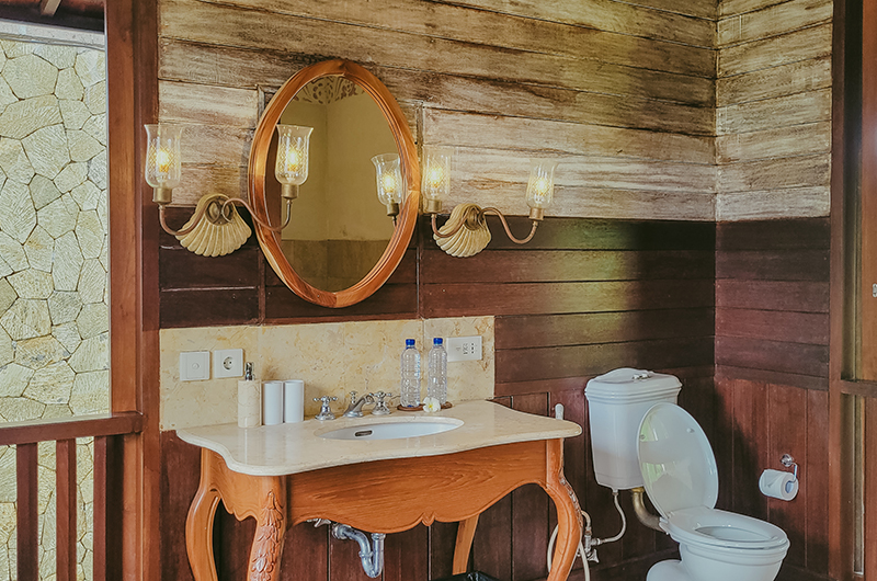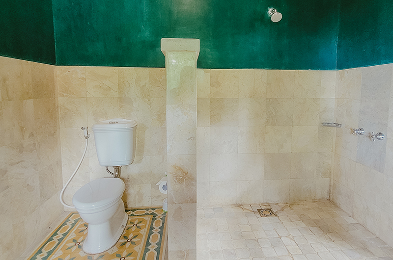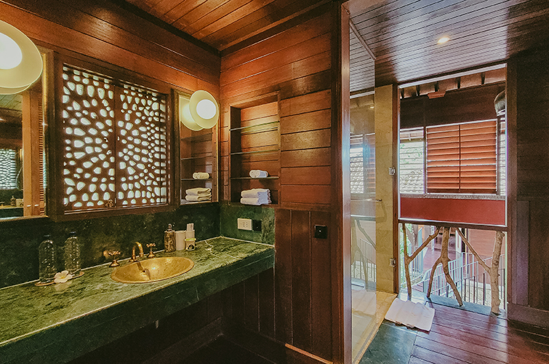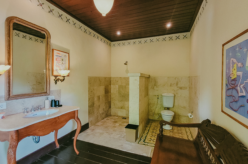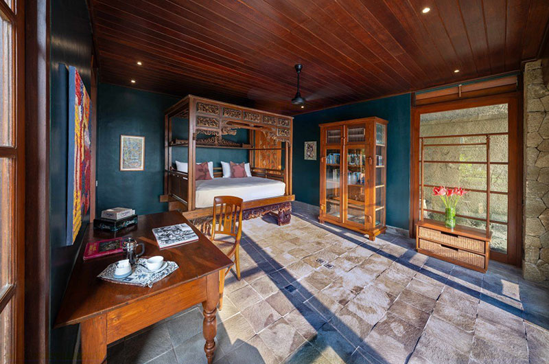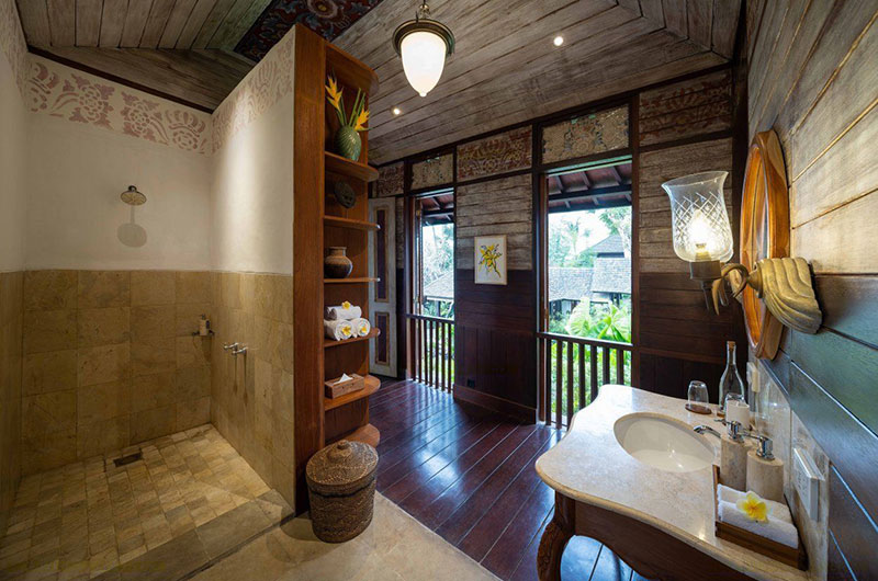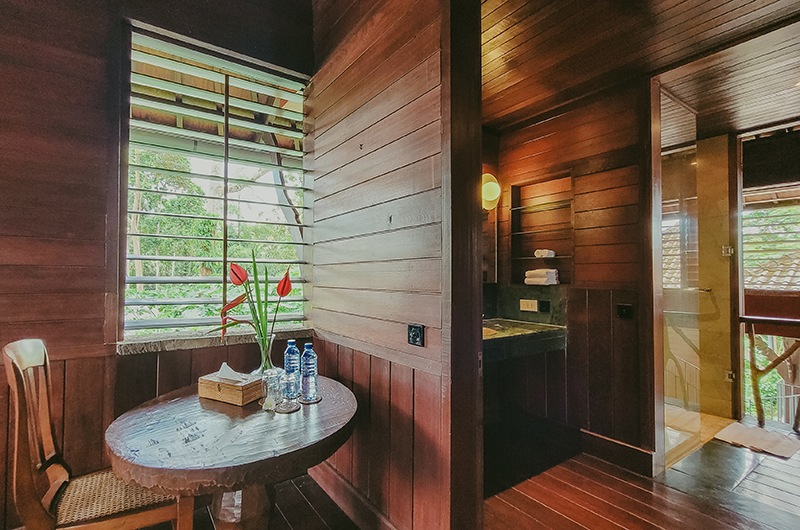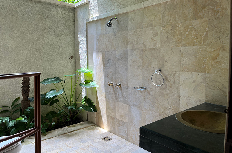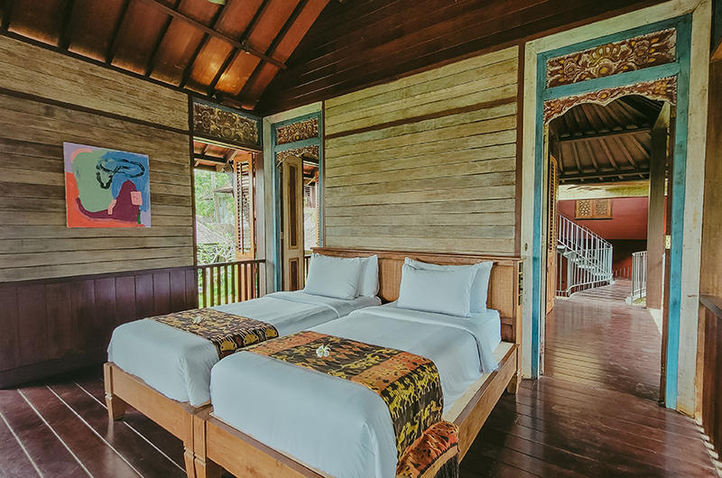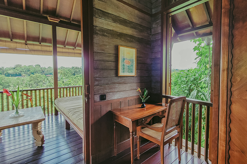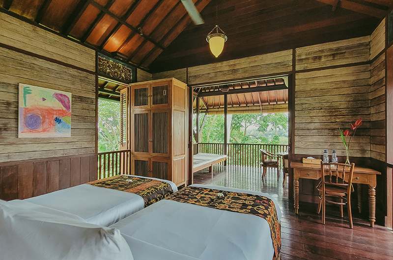 The second bedroom sits high and has a balcony overlooking the Ayung River gorge below. It is furnished with two single beds which can be combined to make a king-size bed, a small desk and the beautiful en-suite marble bathroom with antique washbasin, toilet and shower.