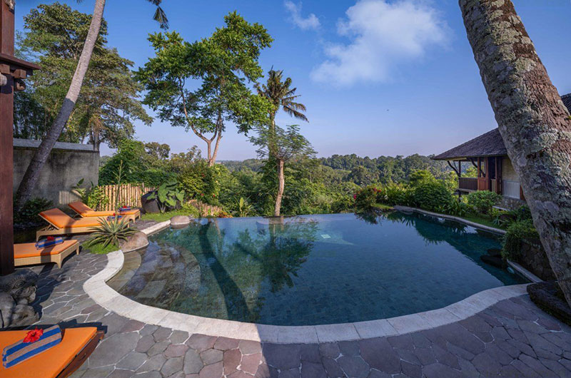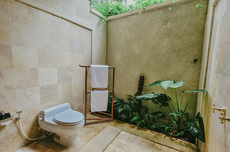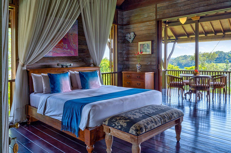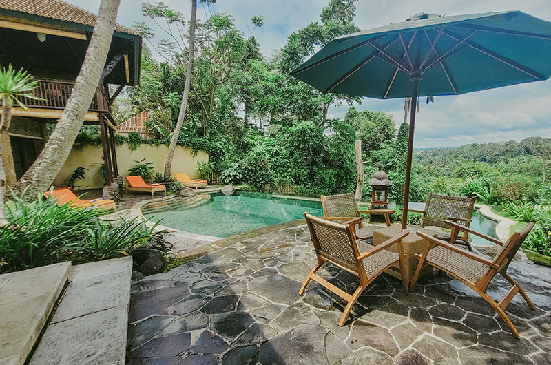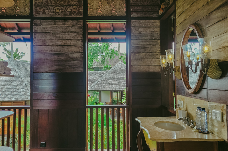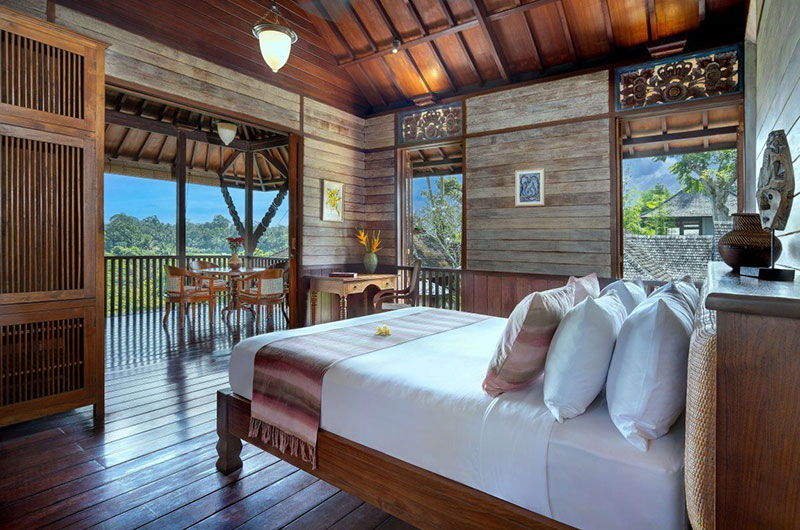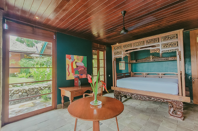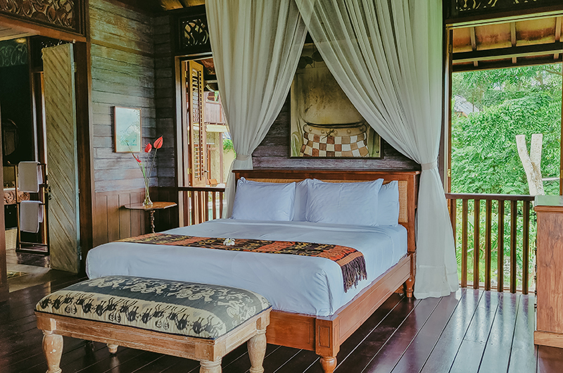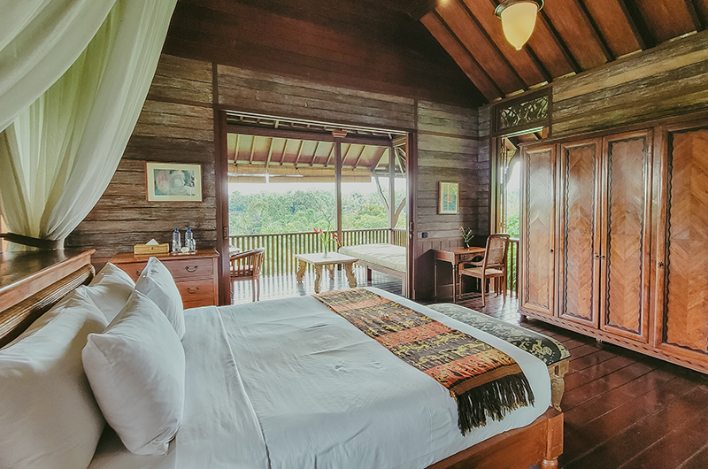 The first bedroom is furnished with a king-size bed, multi-purpose wardrobe and a small desk. The beautiful en-suite marble bathroom has twin washbasins, oval mirrors, a wooden seat toilet and a shower. The bedroom also has a lovely deck which overhangs the Ayung River and the jungle in the valley below.