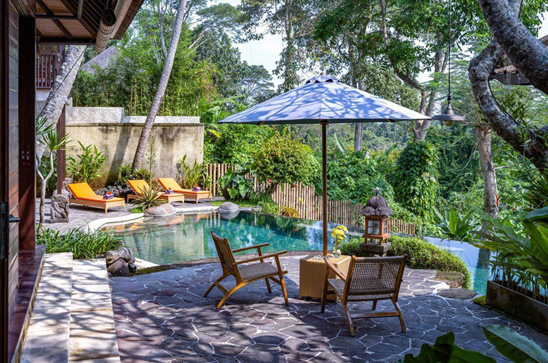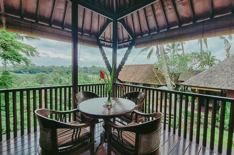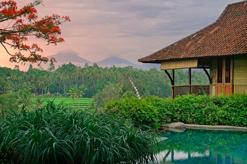 Guests will definitely enjoy the peaceful gardens, the Ayung River below, the rice fields across the way and the distant volcanoes beyond.