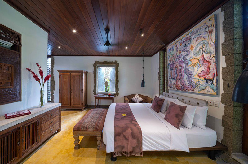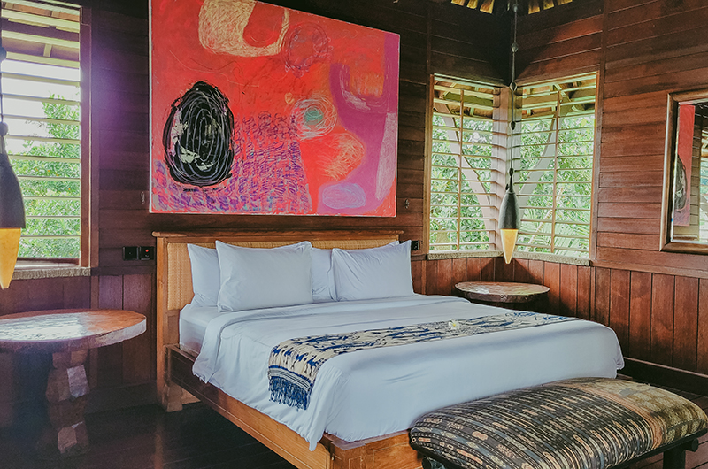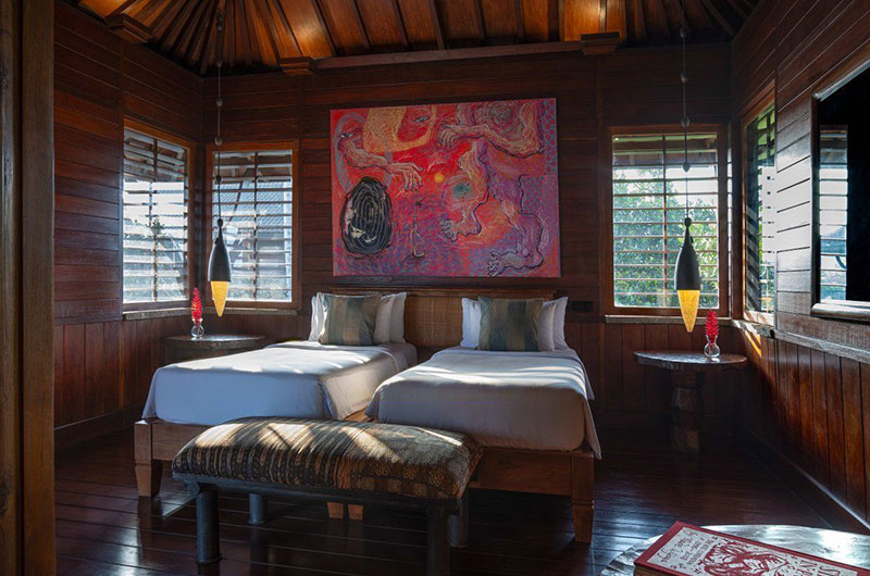 The interior of the villa was crafted with great care, with different atmospheres in each of the bedrooms, interspersed with tranquil and airy living areas. Local sculptor Pintor Sirait worked on the suspended staircase and porte-cochere and Ubud-born artist Wayan Cemul carved all the bases of the stilt houses near the swimming pool.