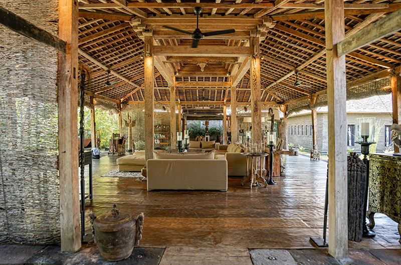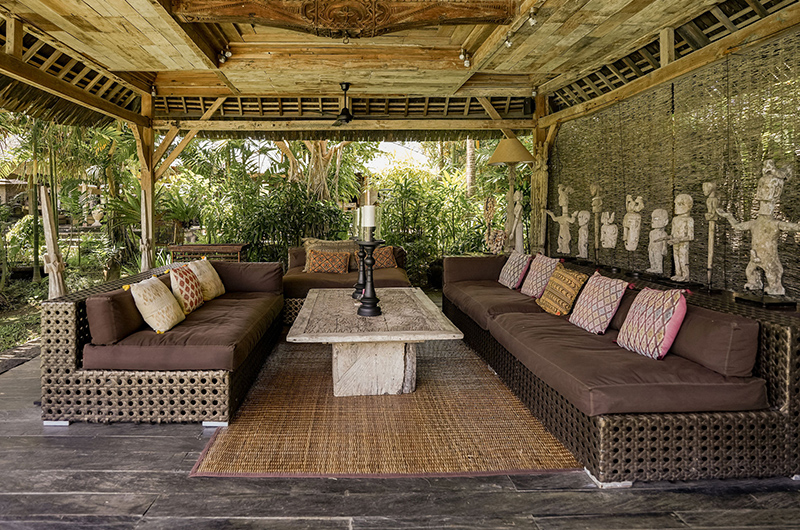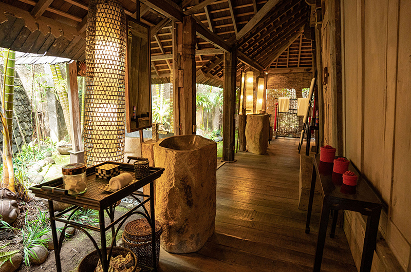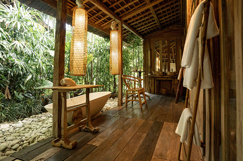 The third bedroom likewise houses a king-sized bed and gorgeous antiques. The room is adjoined by a spacious walk-in wardrobe and a massive indoor/outdoor bathroom which features a bathtub and a rainfall shower, with a small garden area of banana trees and bamboo.