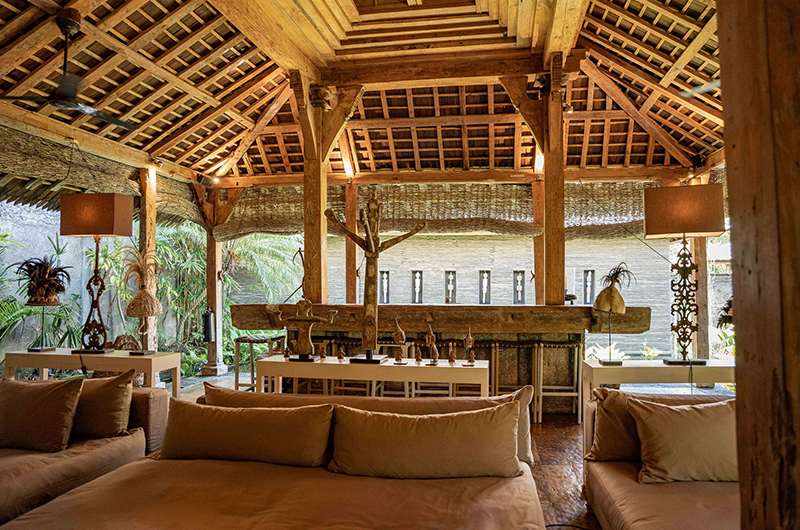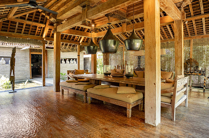 The dining area sits next to the living room in another open-plan pavilion, with a large wooden dining table offering plush seating for up to 14 guests. The villa also features a fully furnished kitchen, with additional seating available on bar stools.