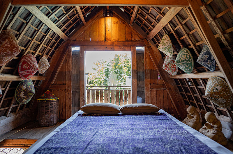 The second bedroom houses 2 singles that can be joined to create a king-size bed with gorgeous antiques decorating the room. The room is adjoined by a spacious walk-in wardrobe and a massive indoor/outdoor bathroom which features a bathtub and a rainfall shower, with a small garden area of banana trees and bamboo.