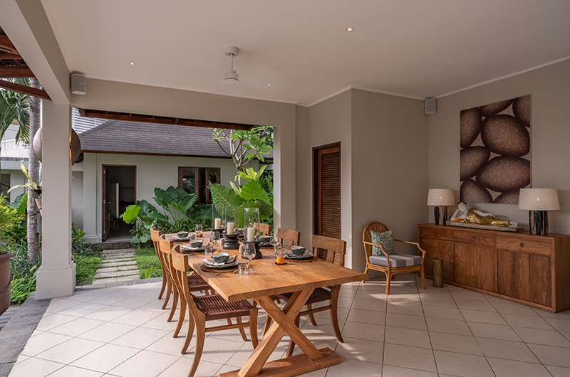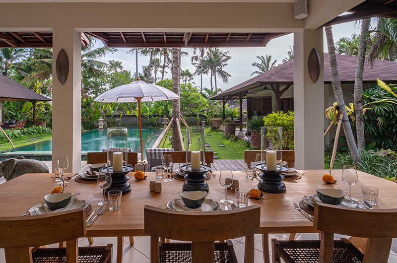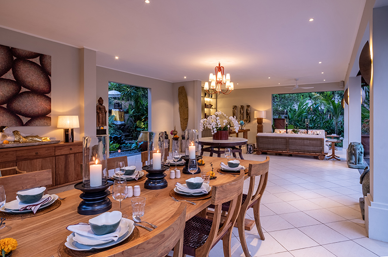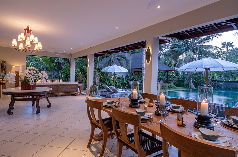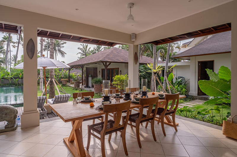 The open-sided lounge area with its soft cream arches is perfect for family and friends to enjoy a drink before dinner. Two sofas to one side allow you to relax in style as they are cooled by ceiling fans or the gentle ocean breeze.