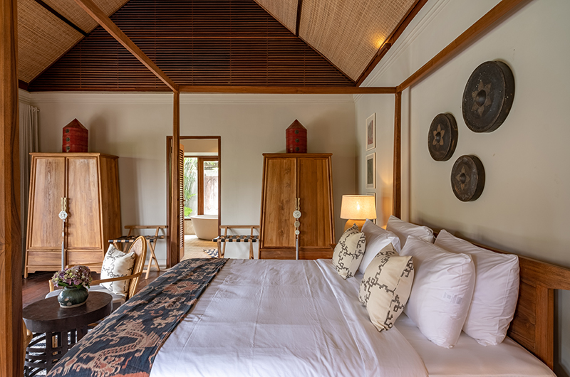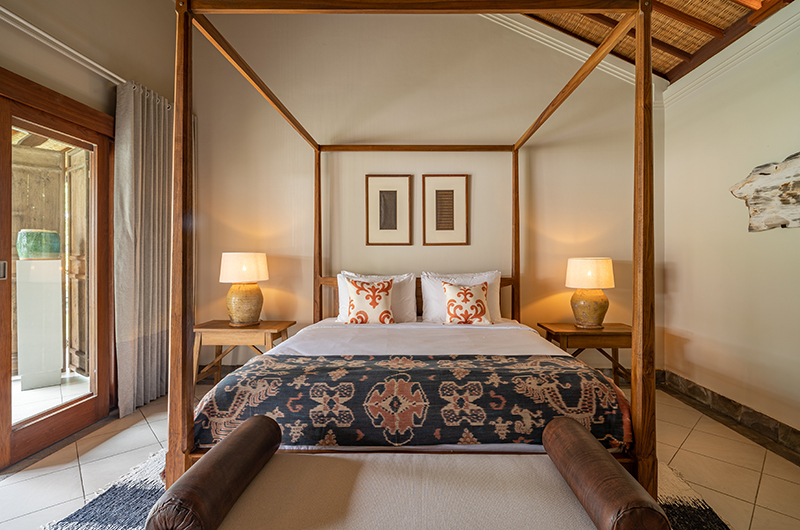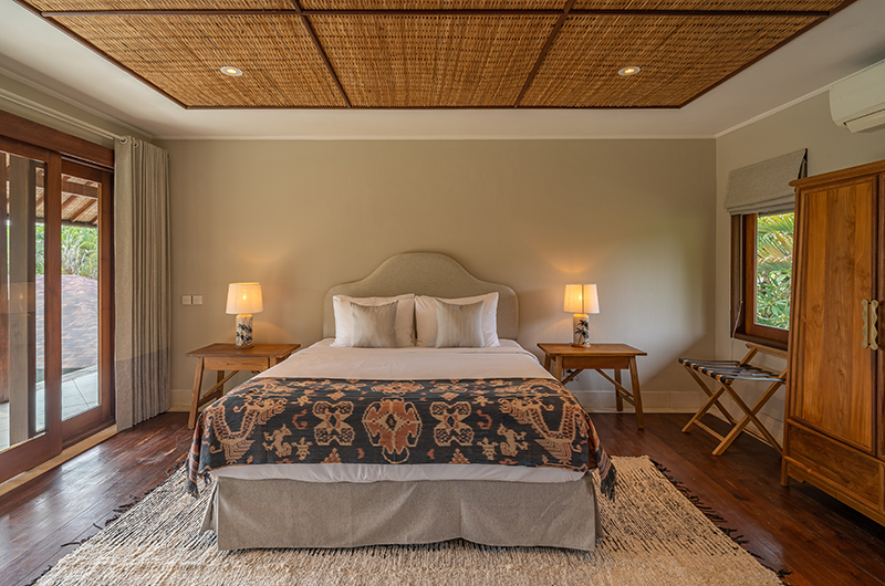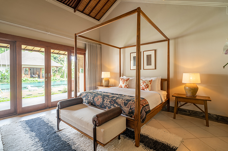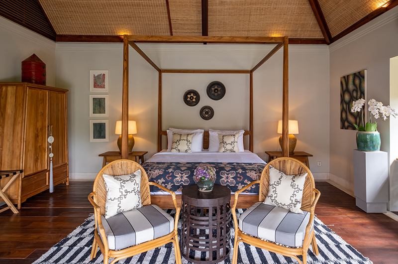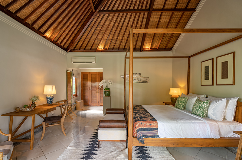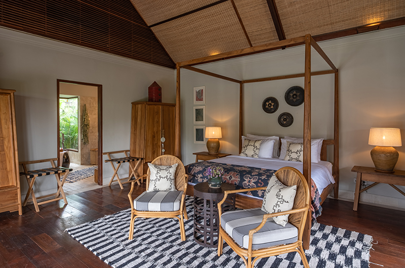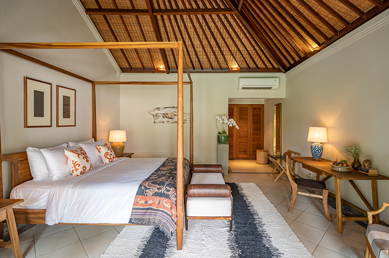 Villa Asmara has four bedrooms. Three rooms have king-sized beds and one room has a queen-sized bed. Three bedrooms are located on ground level in two separate pavilions. One bedroom is located upstairs on the first floor.