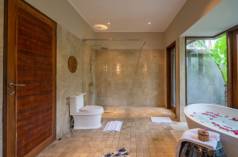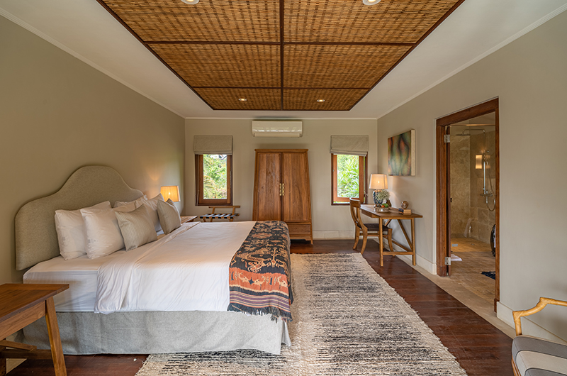 The first master bedroom is located upstairs and accessed through the games room. The room has a queen-sized bed and beautiful views over the rice fields and mountainside. The ensuite bathroom has a Jacuzzi and a shower.