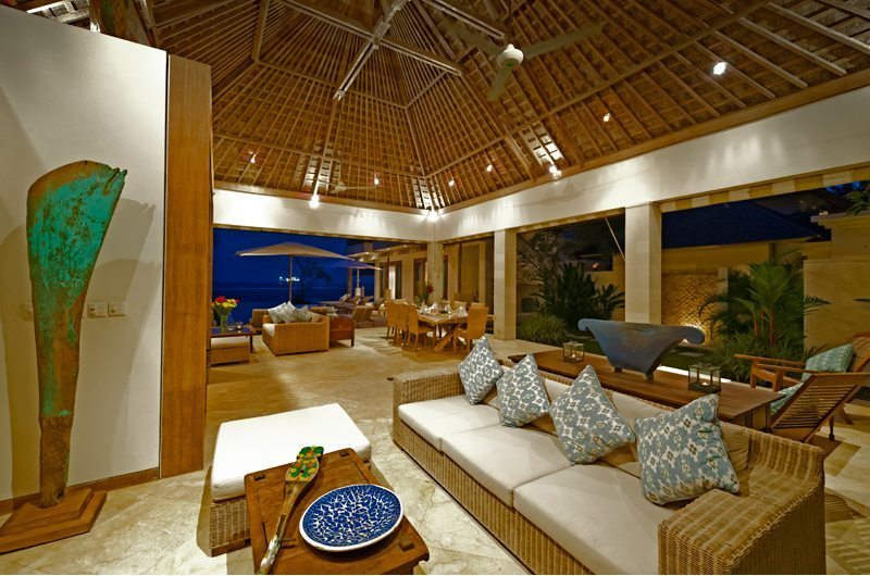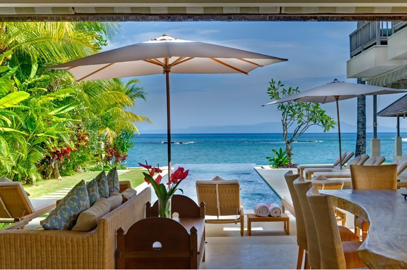 The living room is spacious and offers views of the infinity pool. The room includes local art and antiques and also offers a 42-inch TV with satellite channels and a DVD player.