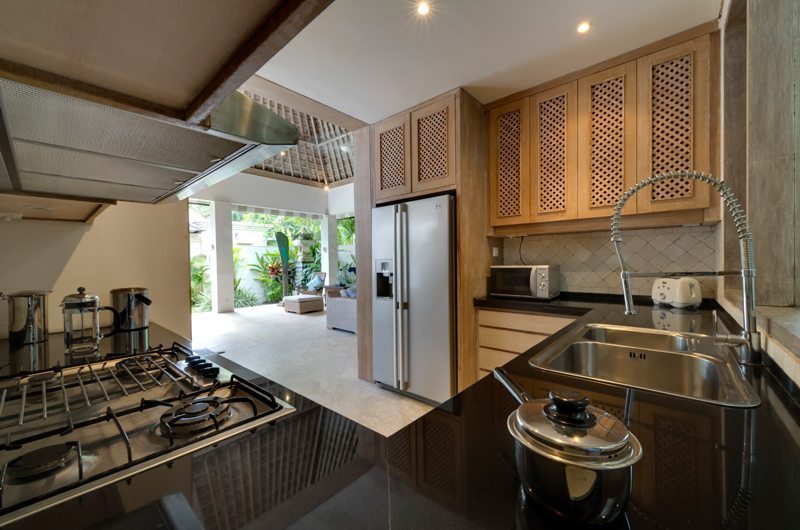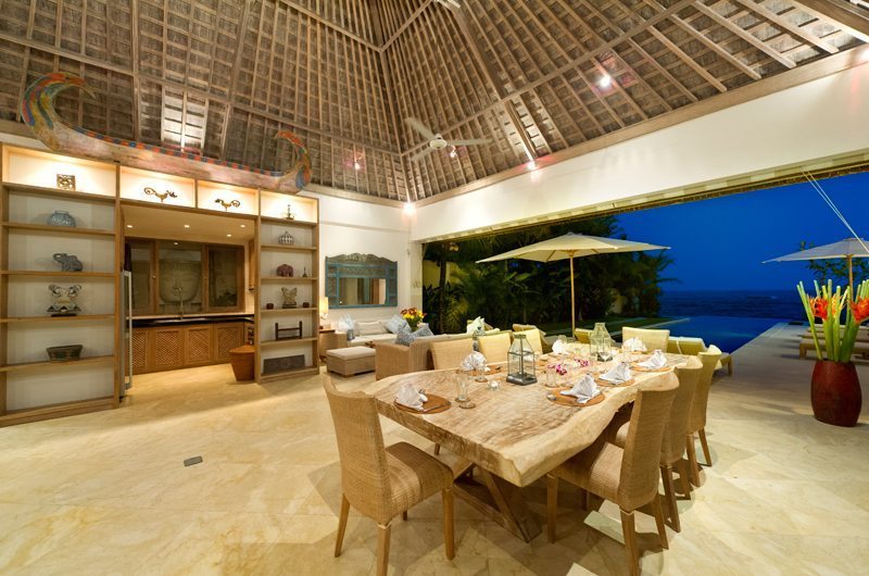 The dining bale is set right on the water’s edge and seats 8. There’s also an indoor dining table which can accommodate up to eight guests. The villa includes a fully furnished kitchen.