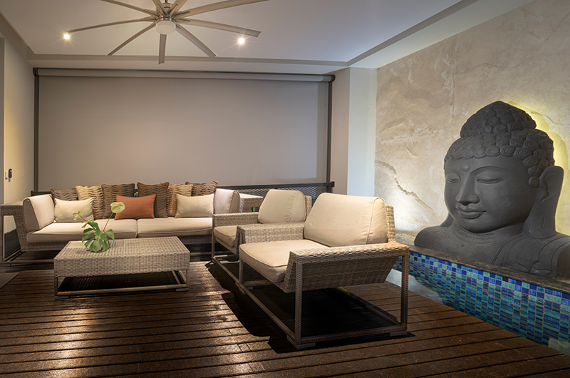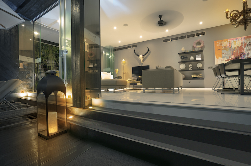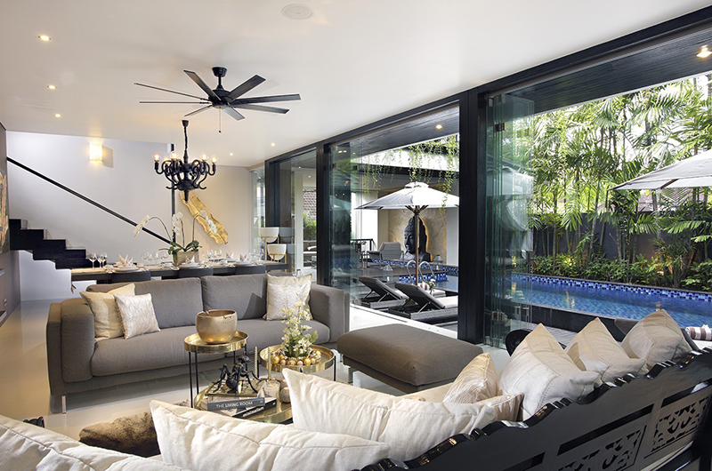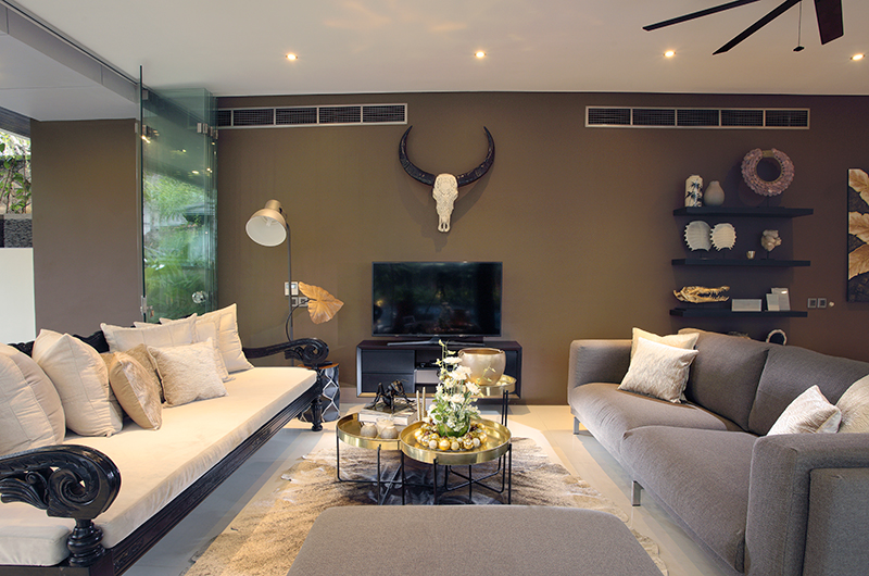 Villa Balimu’s living room faces the pool and can be fully enclosed for air-conditioned comfort with glass doors. The room is styled with light natural tones and furnished with two sofas arranged around a flatscreen TV.