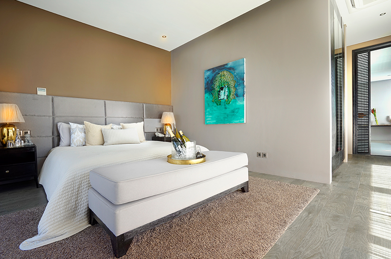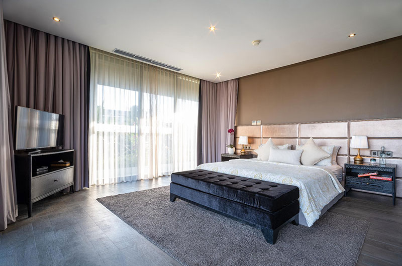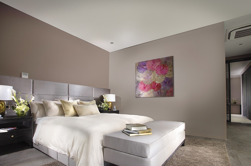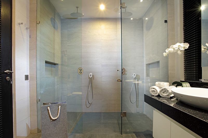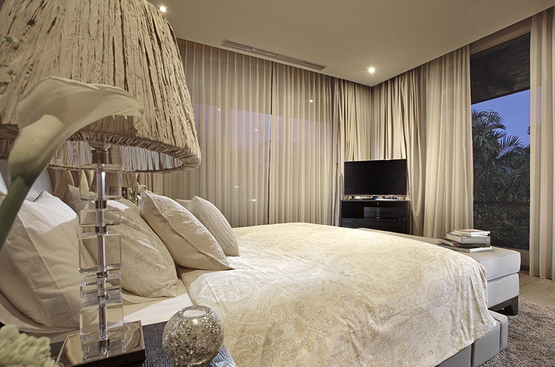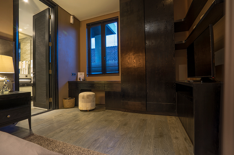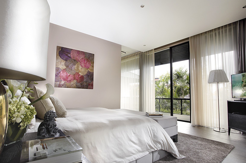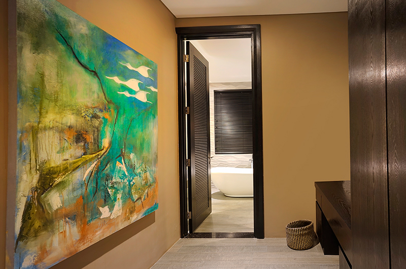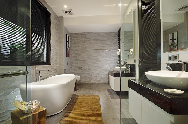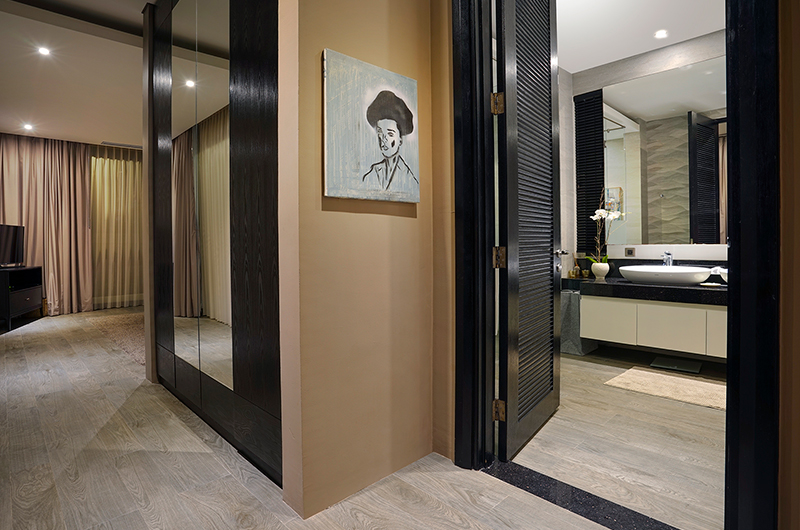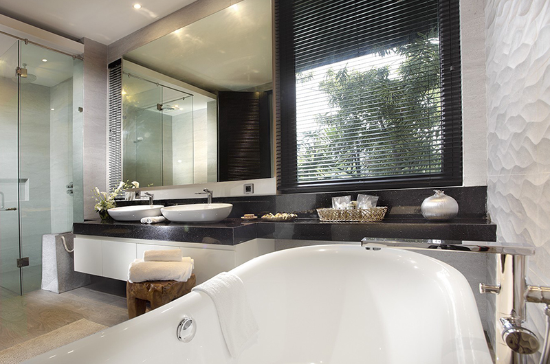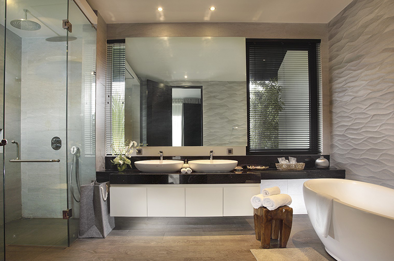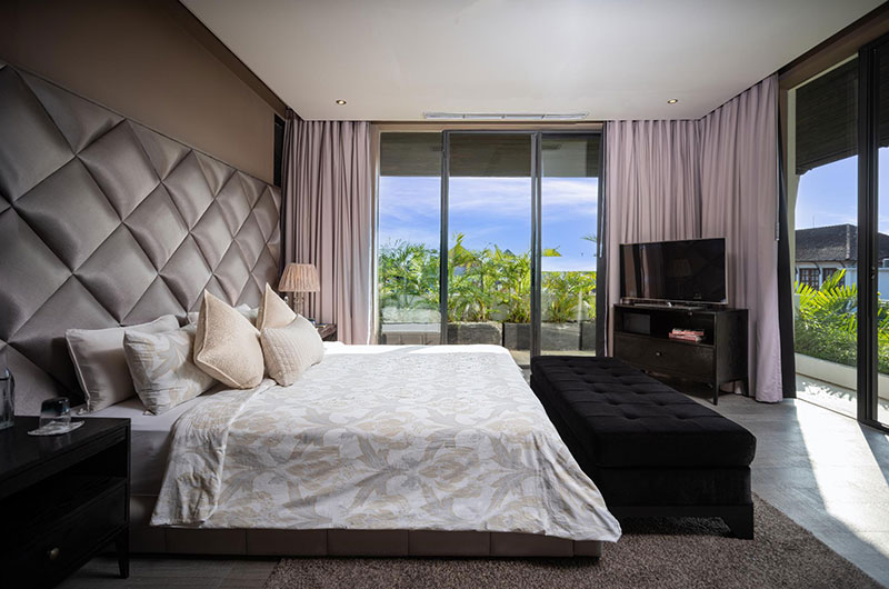 The master bedroom is located upstairs and offers 180-degree views overlooking the pool and Seminyak’s rooftops. The room has a king-sized bed, a TV and an ensuite bathroom with a bathtub and shower.