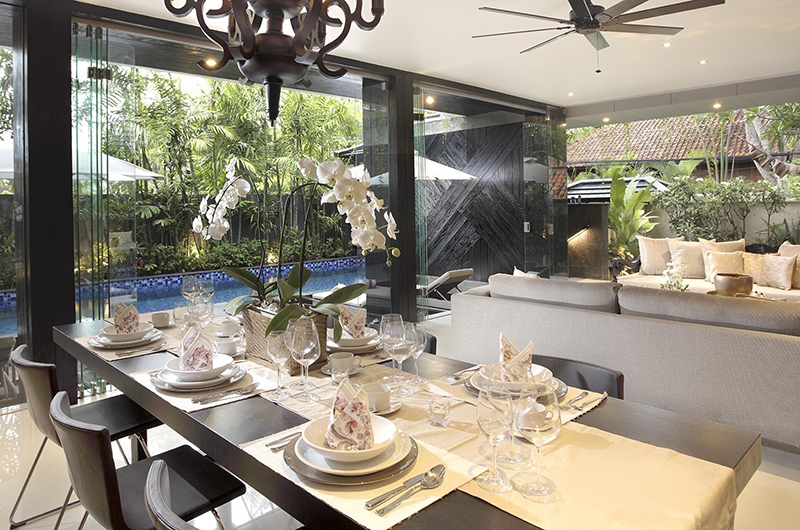 Villa Balimu’s dining table is located in the air-conditioned living room and can easily seat all six guests. The kitchen is located in the staff quarters.
